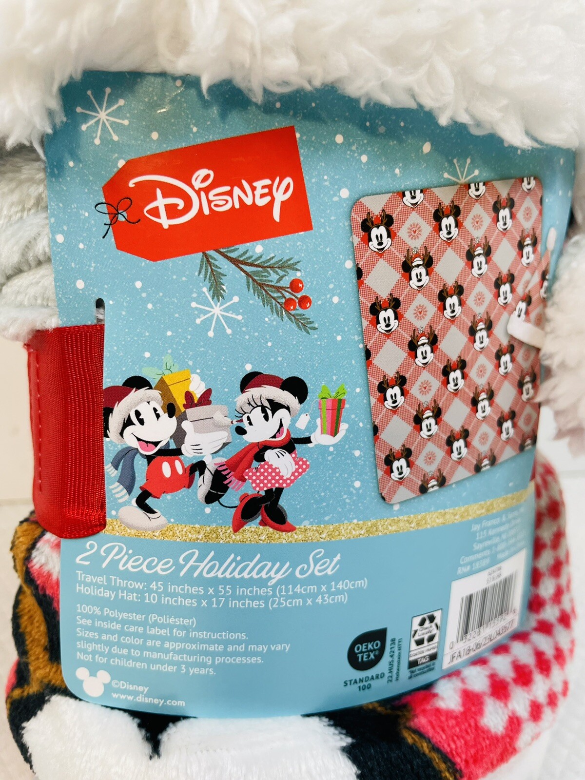 как выглядит Disney Mickey Minnie Mouse 2pc Christmas Hat Travel Throw Blanket Set NEW фото