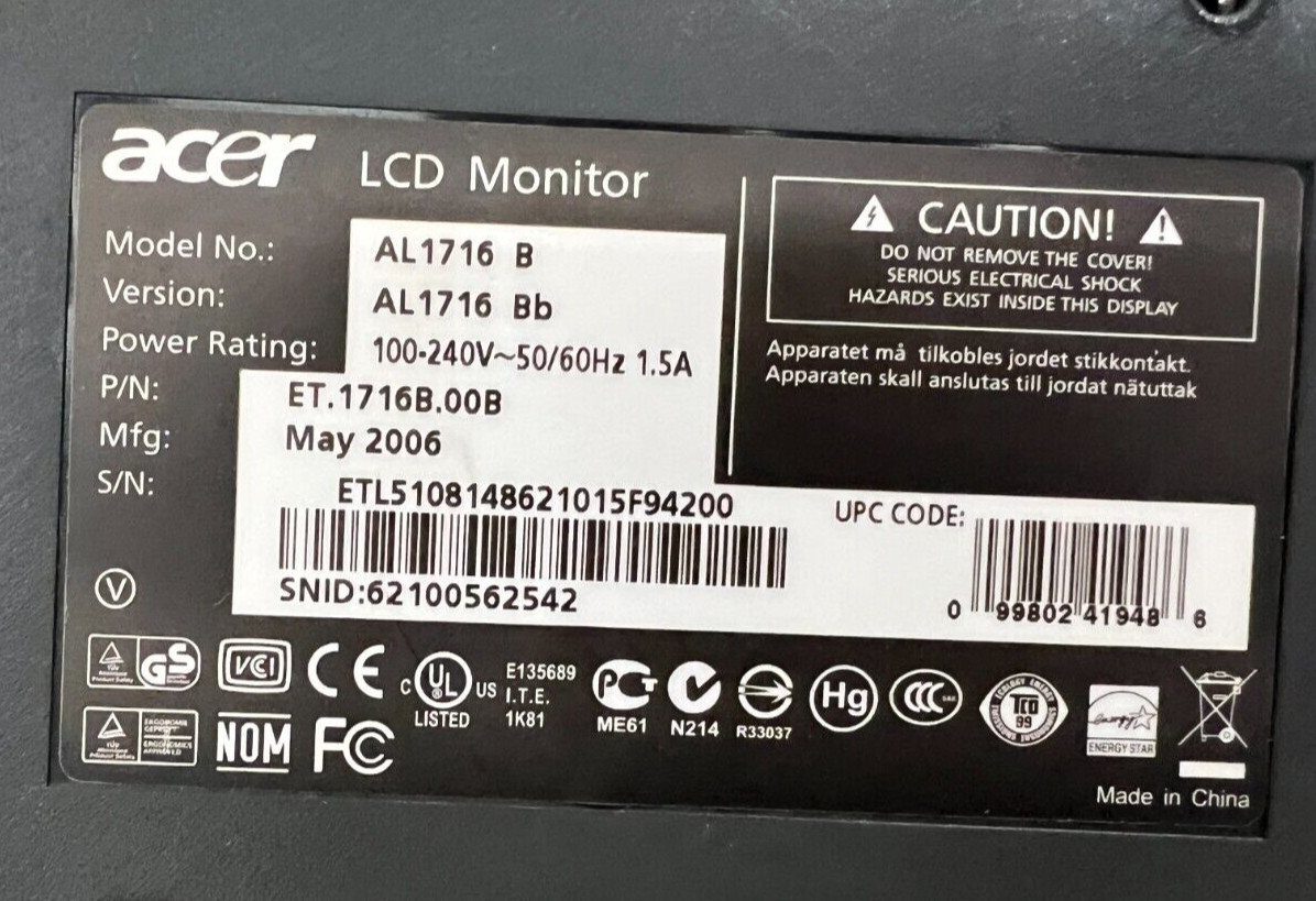 ACER LCD MONITOR AL1716 B 100-240V 50/60HZ 1.5A 17 SCREEN