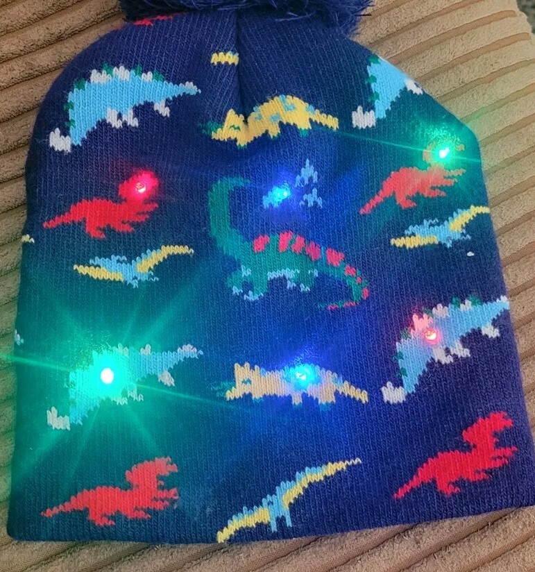 Kids Dinosaur Lighted Stocking Cap Blue Beanie w Blink or Stationary Lights
