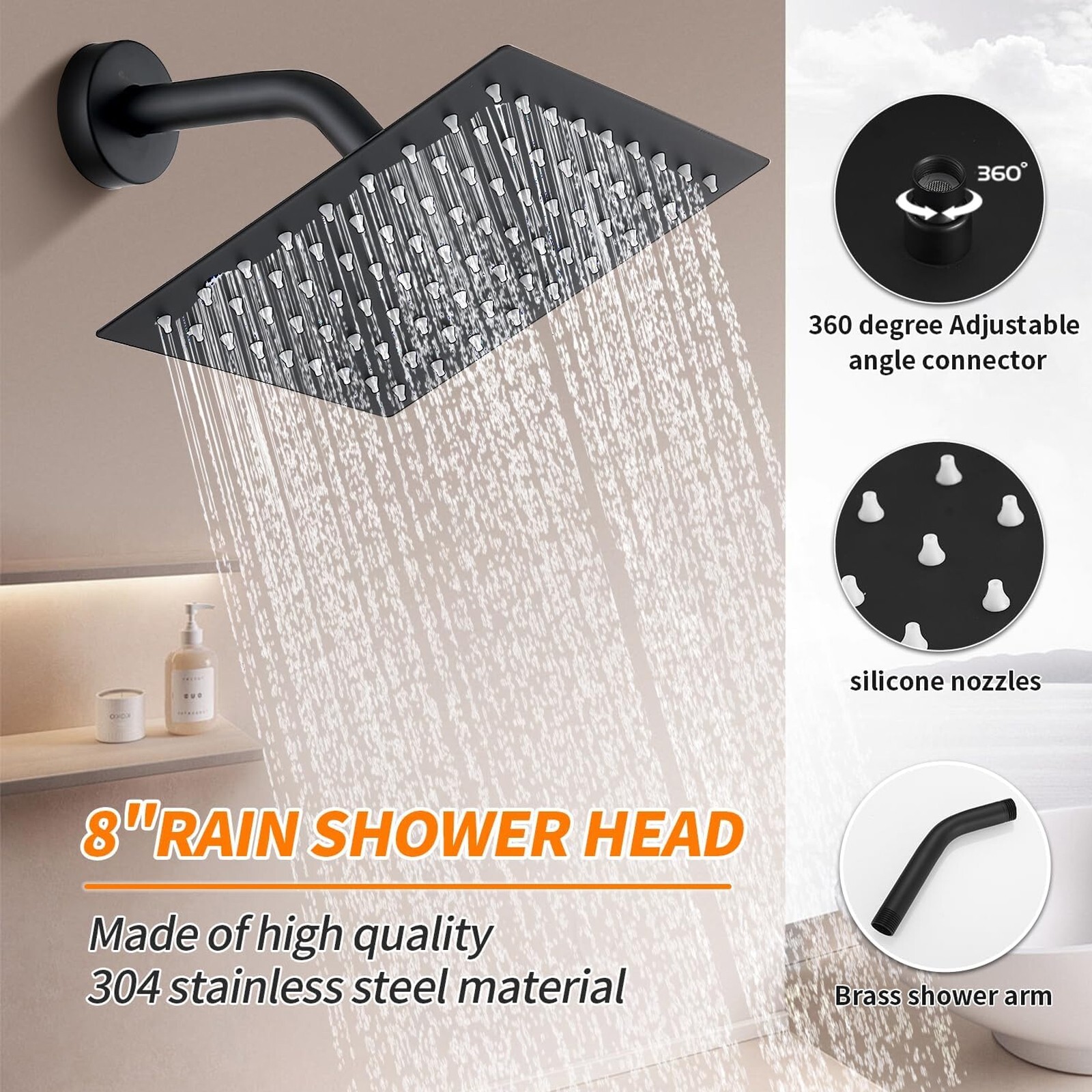 Black Tub Shower Faucet Set Valve Included with 8Rain Shower Head and Tub Spout