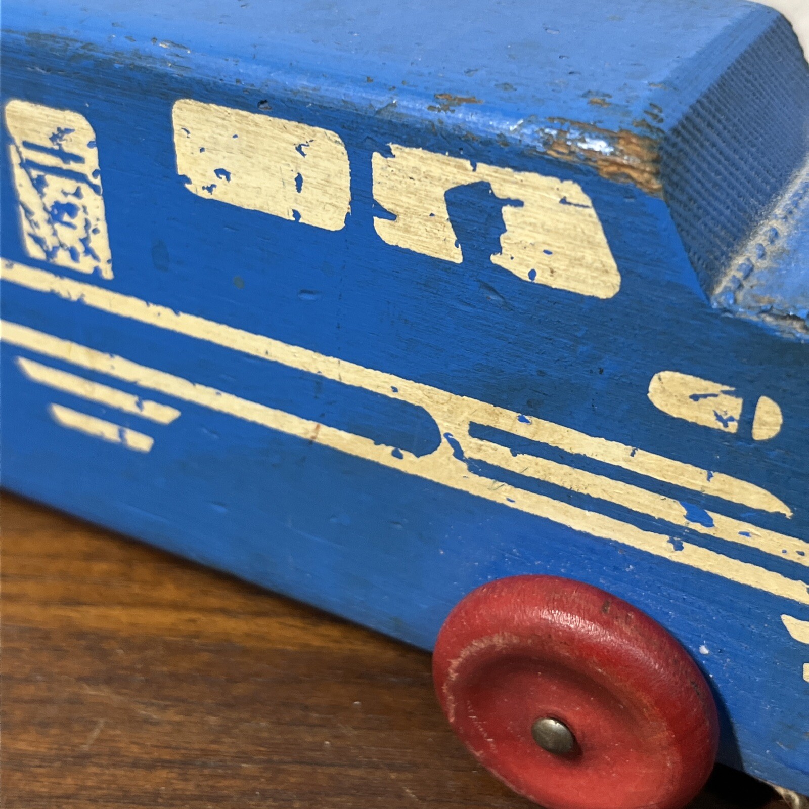 Vintage Wooden Block Pull Toy Train Painted White Graphics Red Blue
