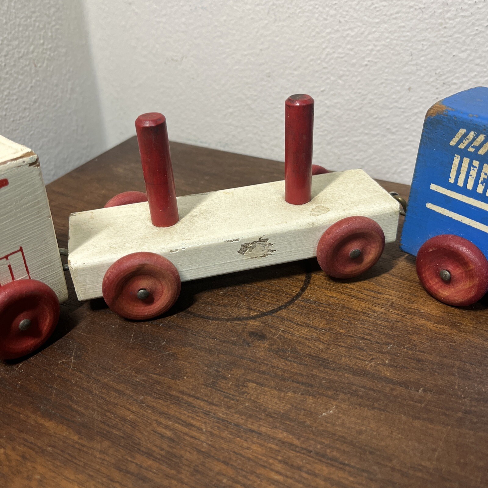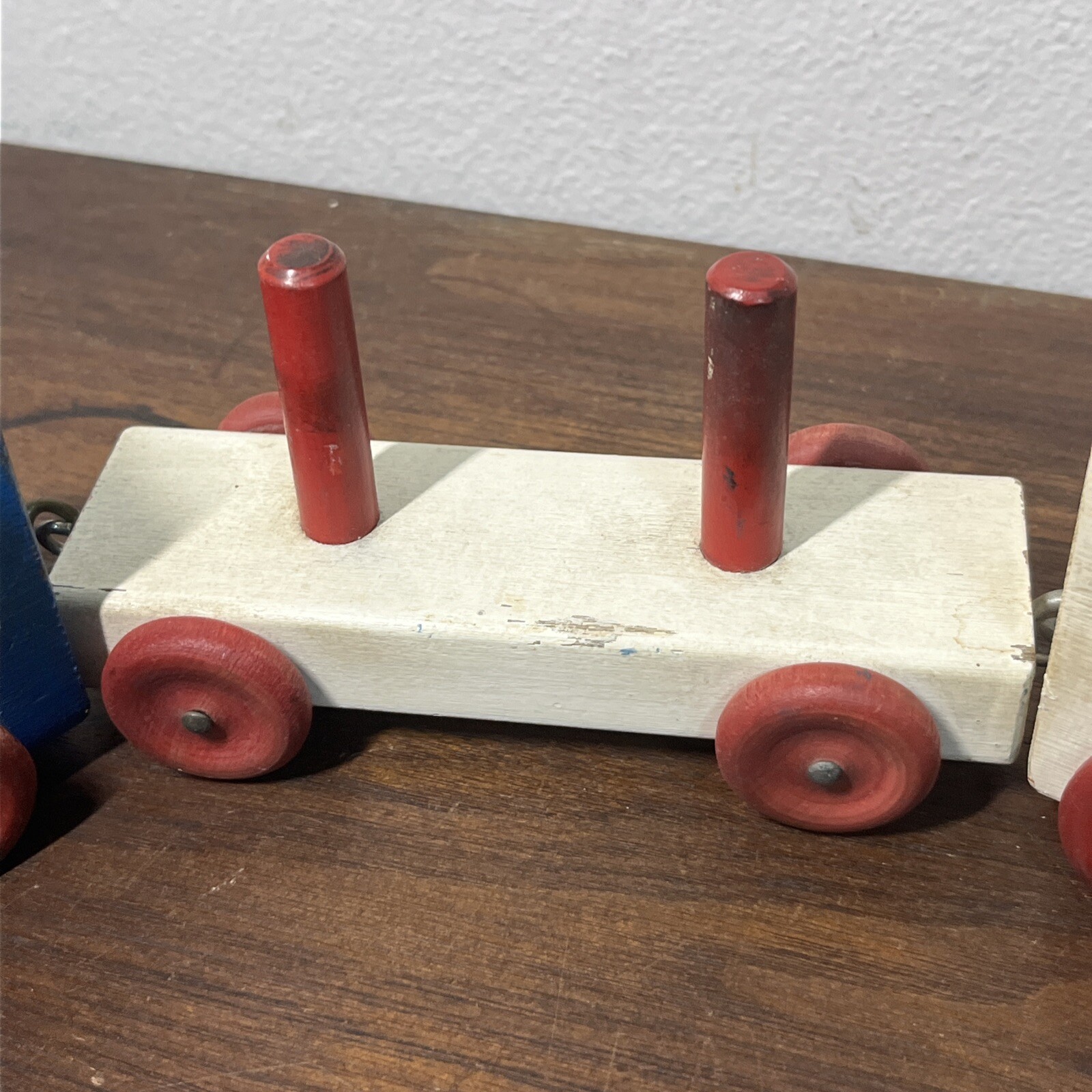 как выглядит Vintage Wooden Block Pull Toy Train Painted White Graphics Red Blue фото