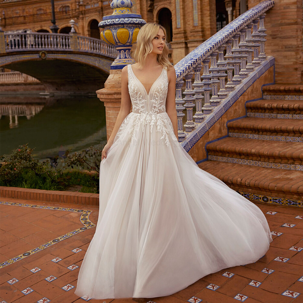 как выглядит Boho A-Line Wedding Dresses Deep V-Neck Sleeveless Lace Appliques Bridal Gowns фото