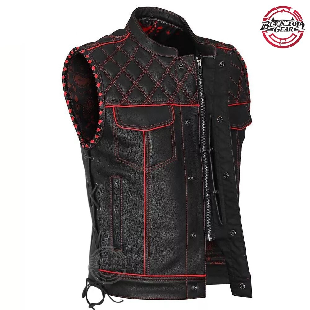 Men's Black Leather Vest Diamond Motorbike Motorcycle RED Concealed Waistcoat