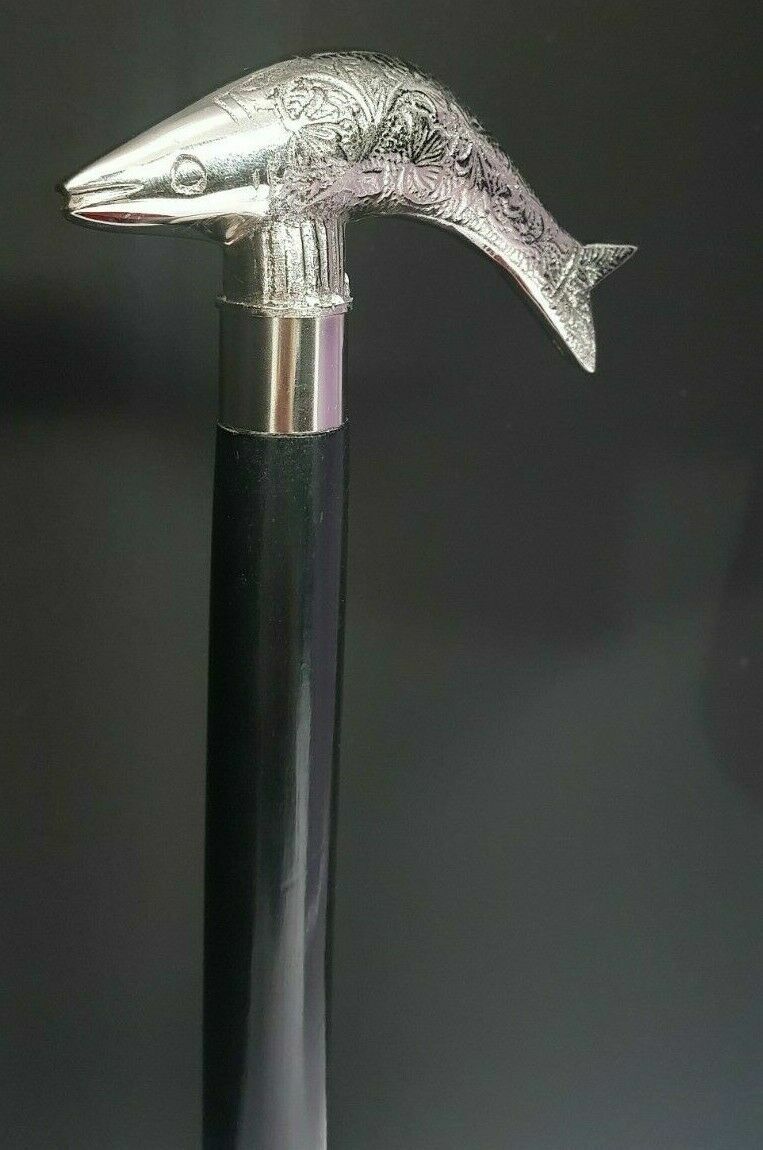 Style Victorian Cane Wooden Walking Stick Designer Chrome Brass Fish Handle Gift