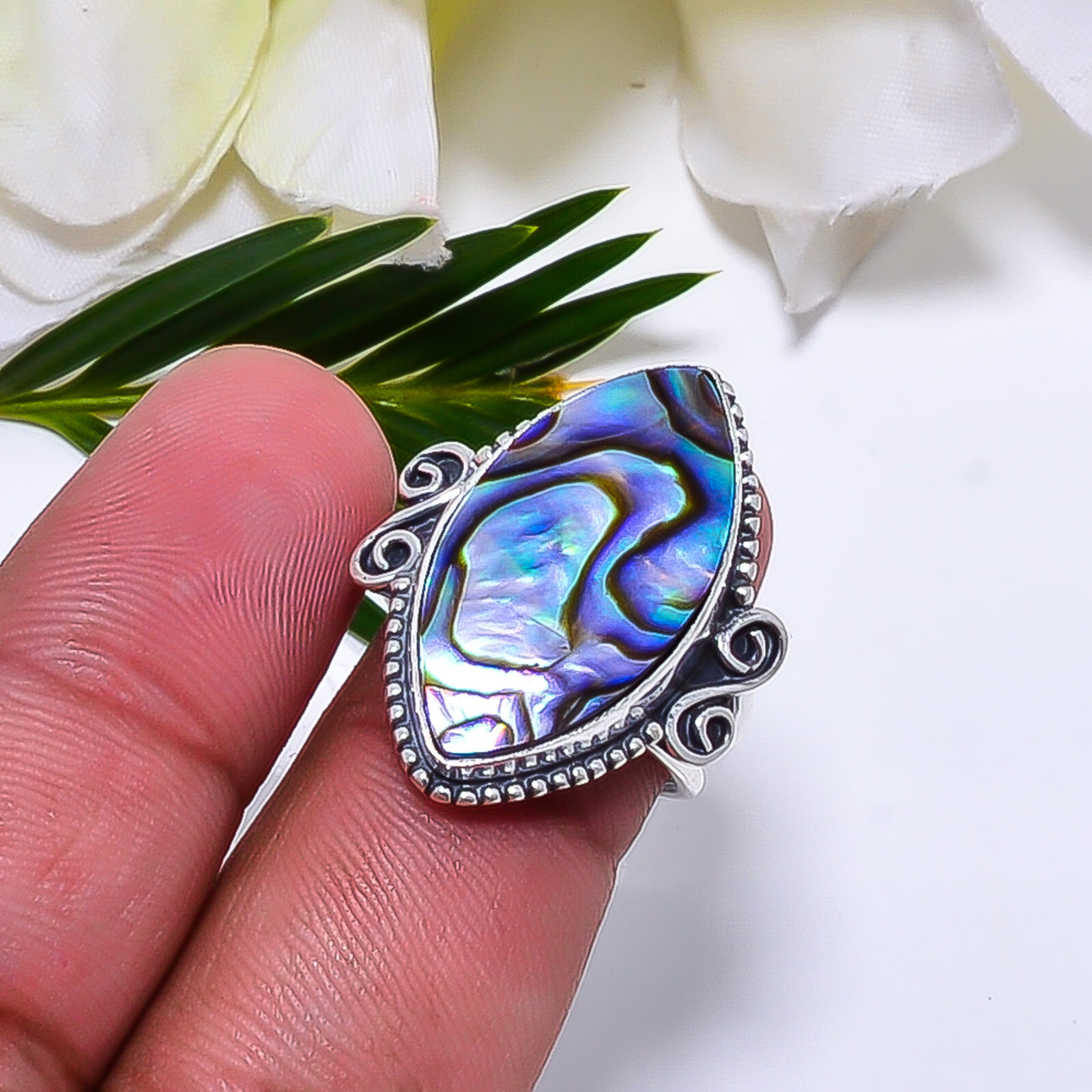 Natural Abalone Shell Gemstone 925 Sterling Silver Ring Oxidize Jewelry Gift.