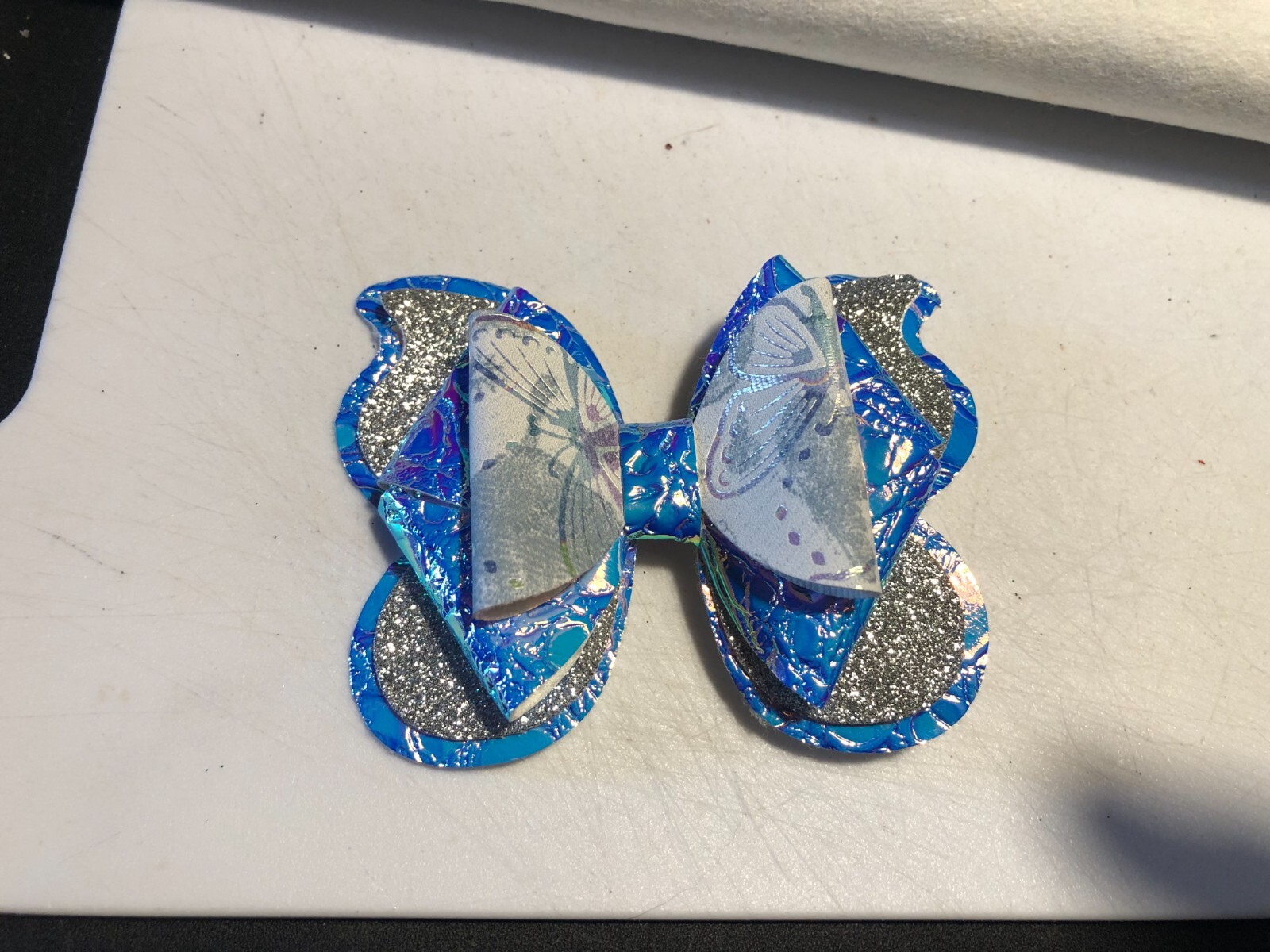 BUTTERFLY DESIGN HAIR BOW. HOLOGRAPHIC BLUE AND SILVER. 3.5 X 3. HOMEMADE