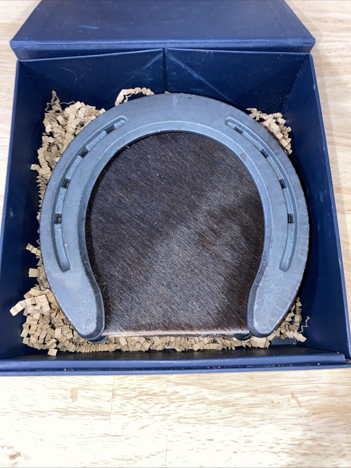 как выглядит 5 inch Metal Horseshoe Coaster Set of 4 Cowhide On Cork Handmade In Gift Box фото