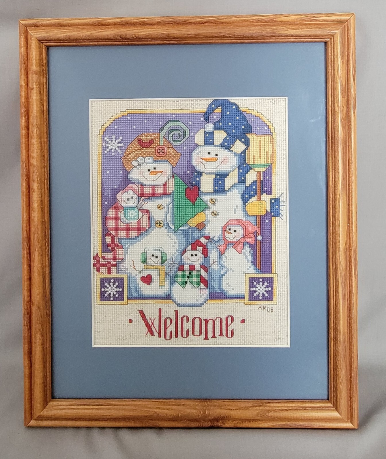 Framed Winter Theme Needlepoint 2008 Signed Snowmen People Family