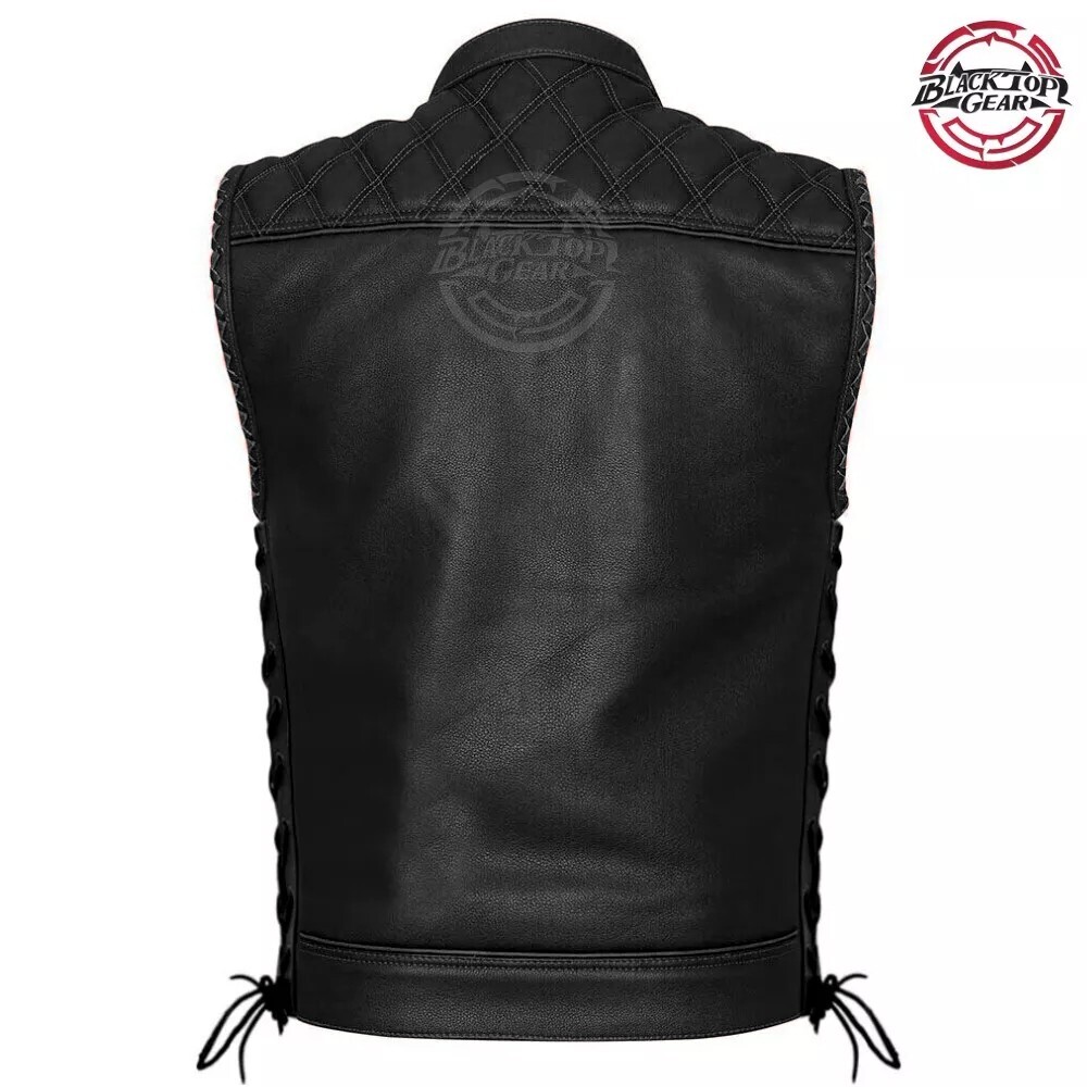 Men's Black Leather Vest Diamond Side Laces Motorcycle Black Concealed Waistcoat