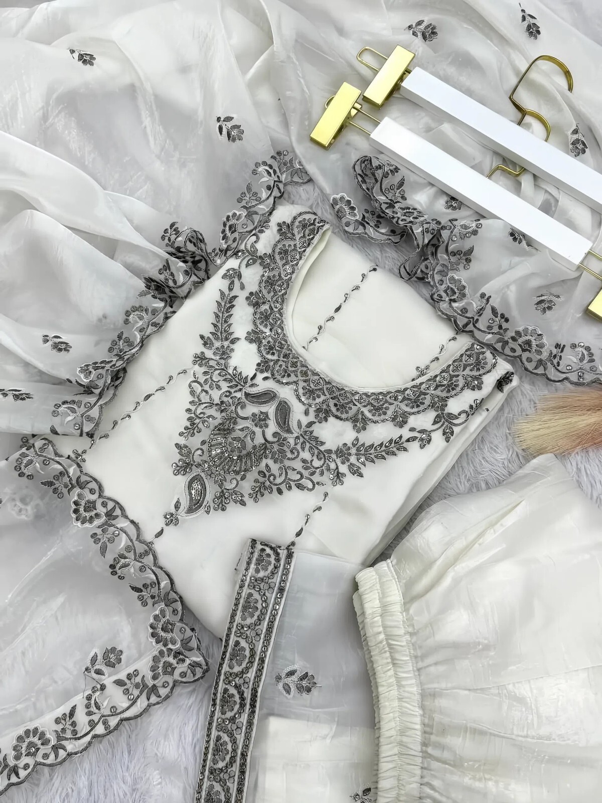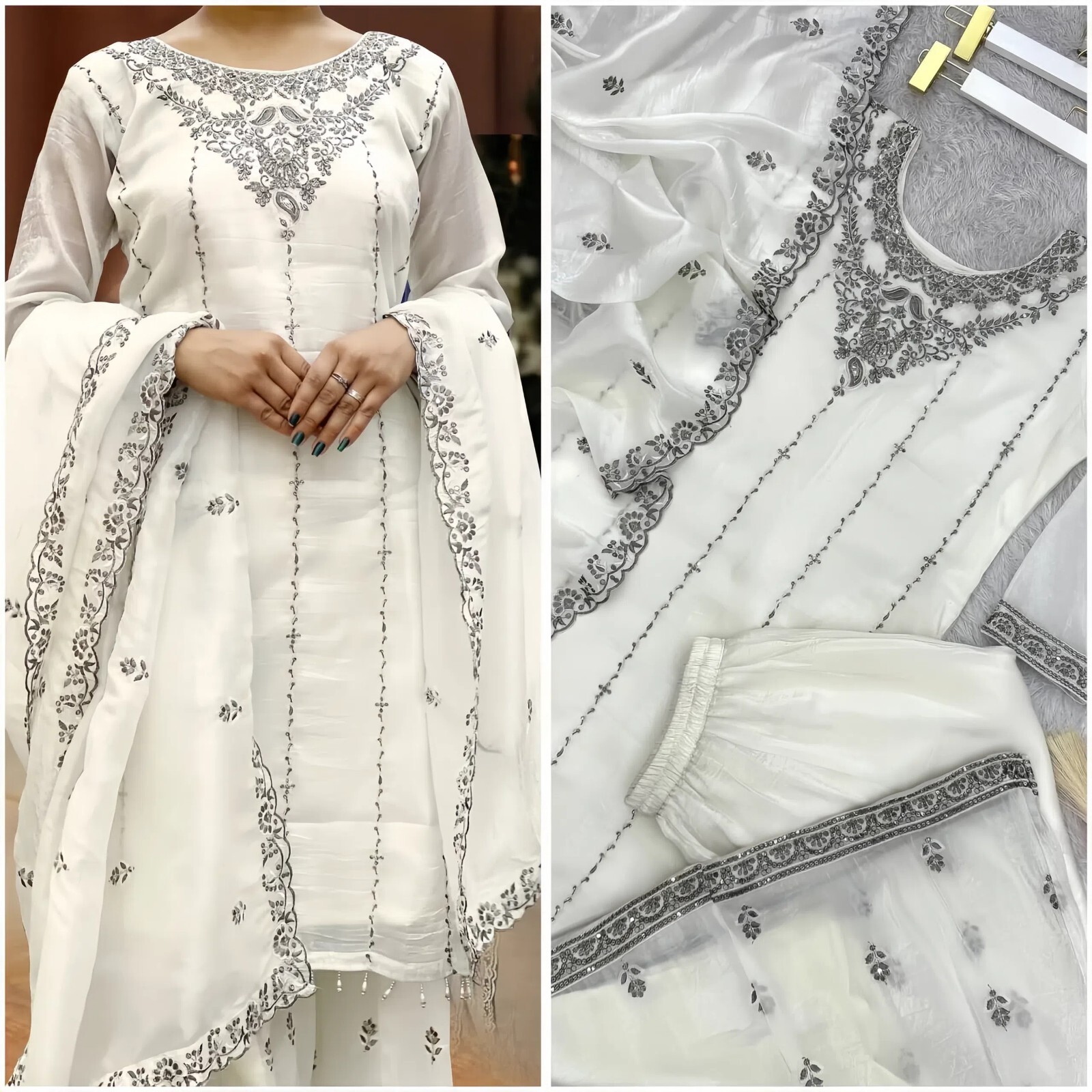как выглядит White Georgette Embroidered Salwar Suit Set with Grey Floral Pattern фото