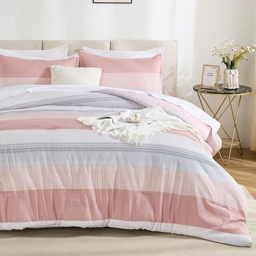Full Size Comforter Set 7 Pieces - Pink Striped Lightweight Bed in a Bag,