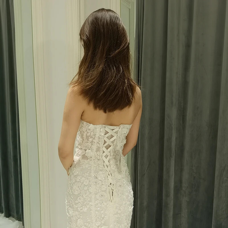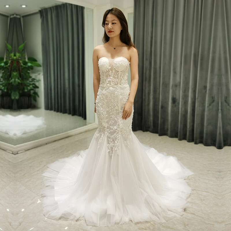 как выглядит Boho Mermaid Wedding Dresses Strapless Backless White Lace Applique Bridal Gowns фото