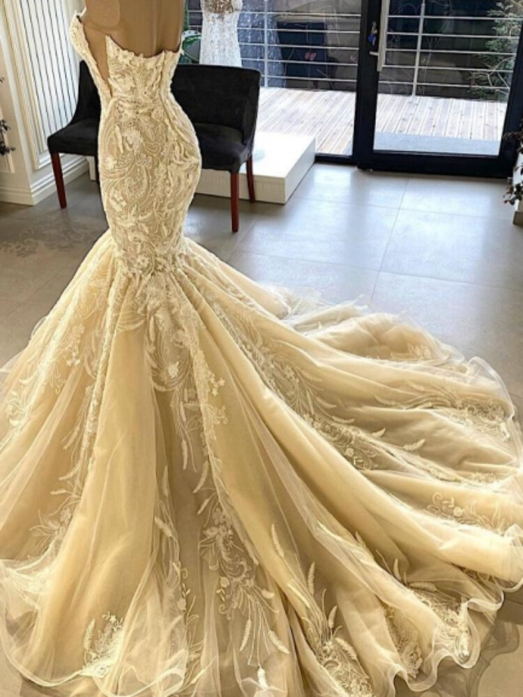 Ivory Mermaid Wedding Dresses strapless Lace Applique Sweep Train Bridal Gowns