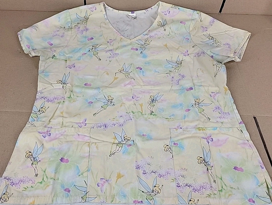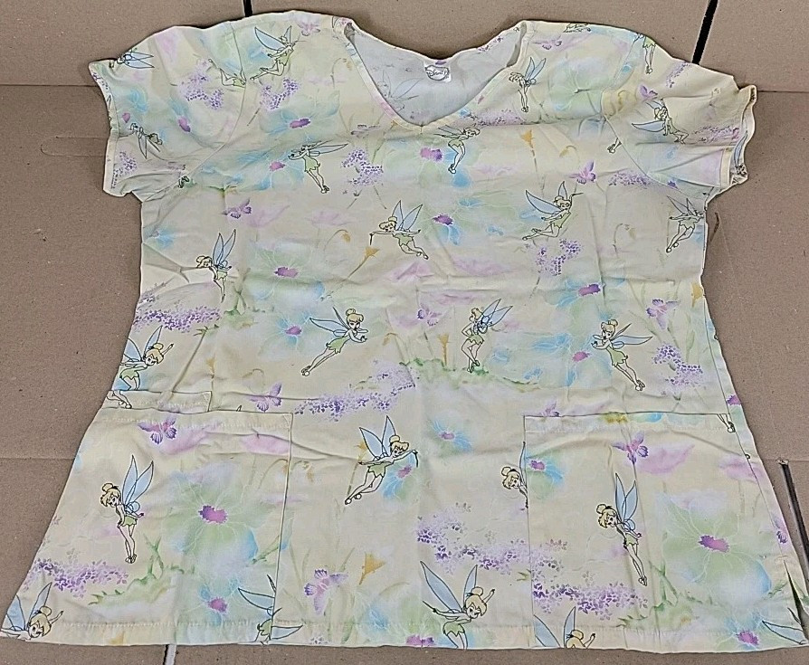 Disney Tinkerbell Scrub Top Womens Medium Yellow V Neck Nursing Medical Pockets
