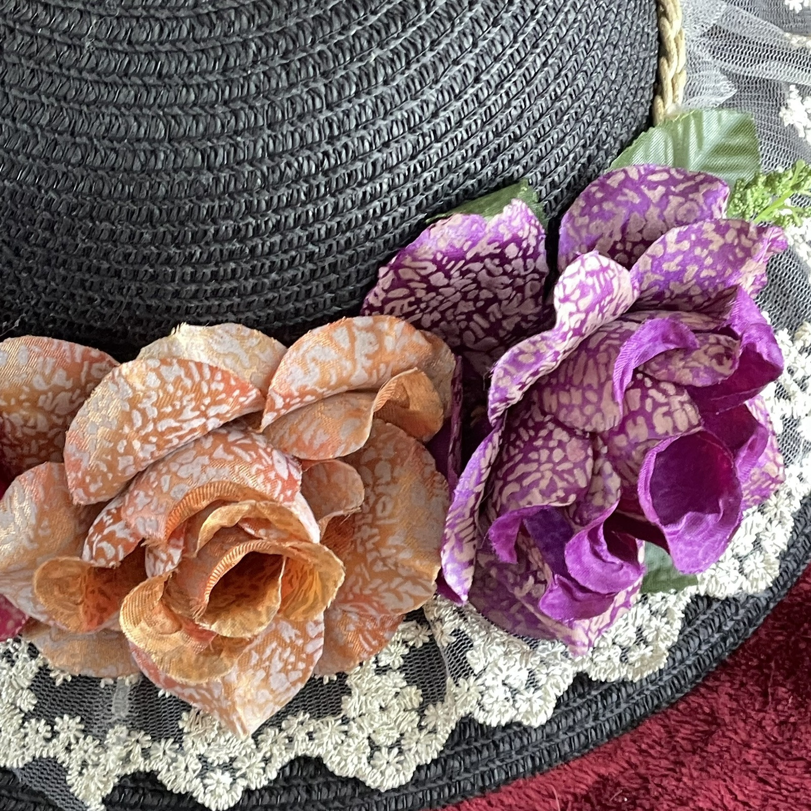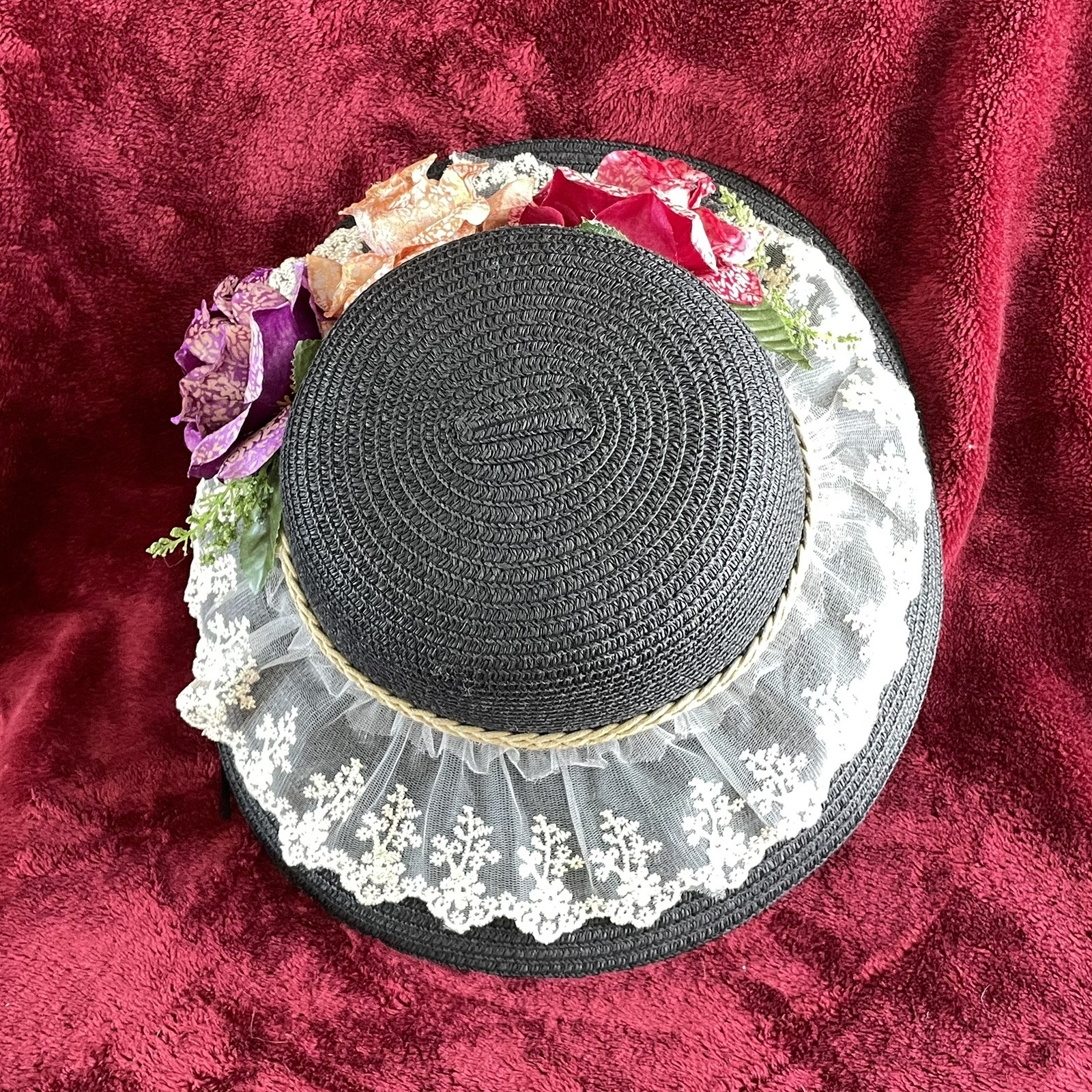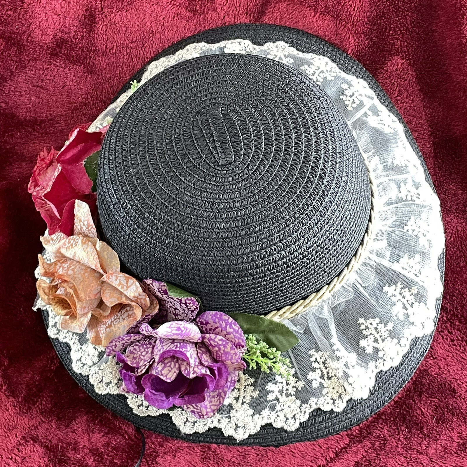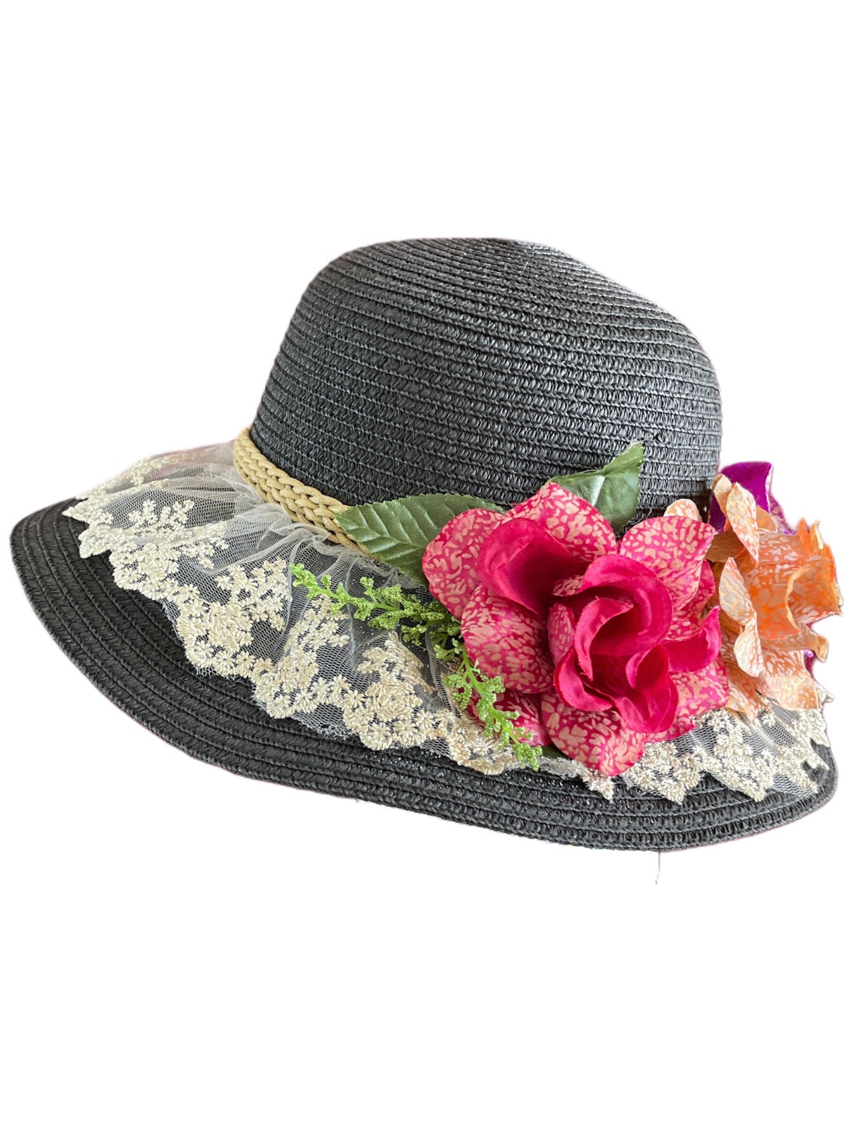 Women s Wide Brim Hat Black With 3 Flowers and Lace Trim Easter Kentucky Derby