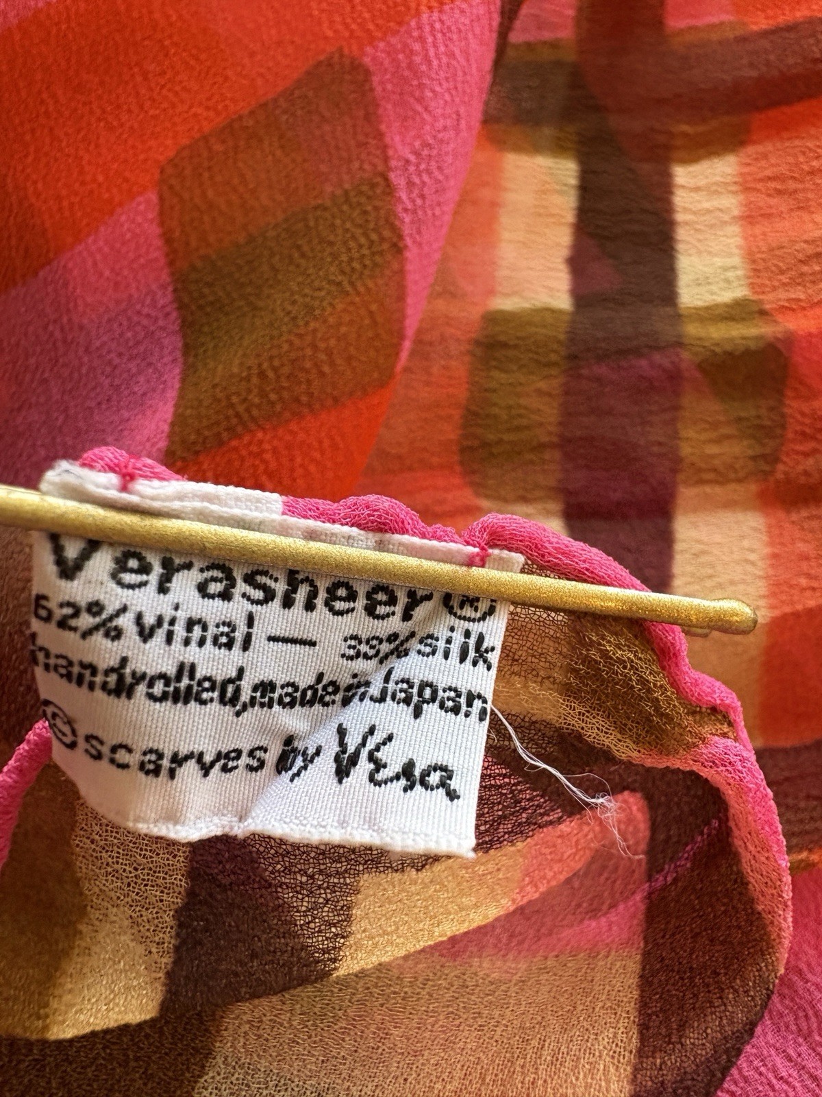 как выглядит Vtg 70s Vera Silk/Vinal Rectangle Scarf Red Pink Brown Geometric Grid Pattern фото