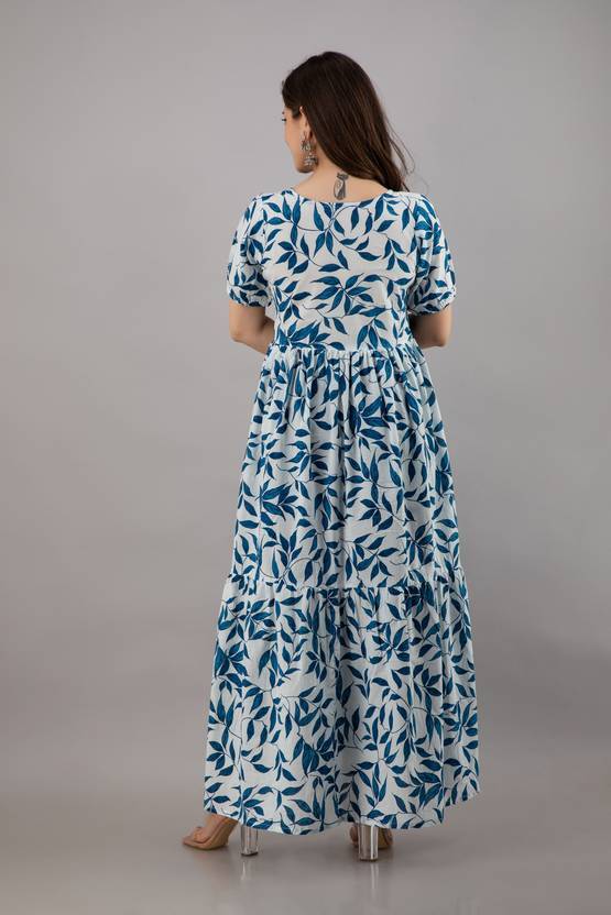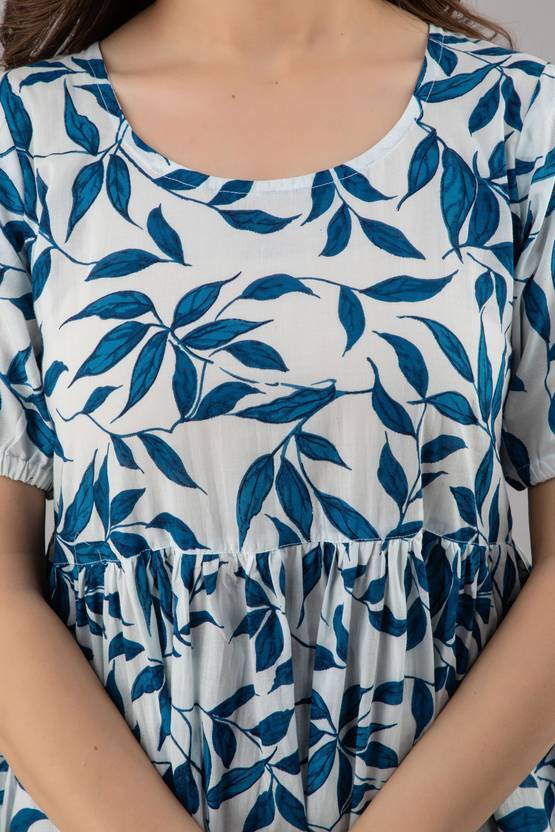 Indian Women blue Cotton Floral Printed Anarkali Kurta Kurti Dress