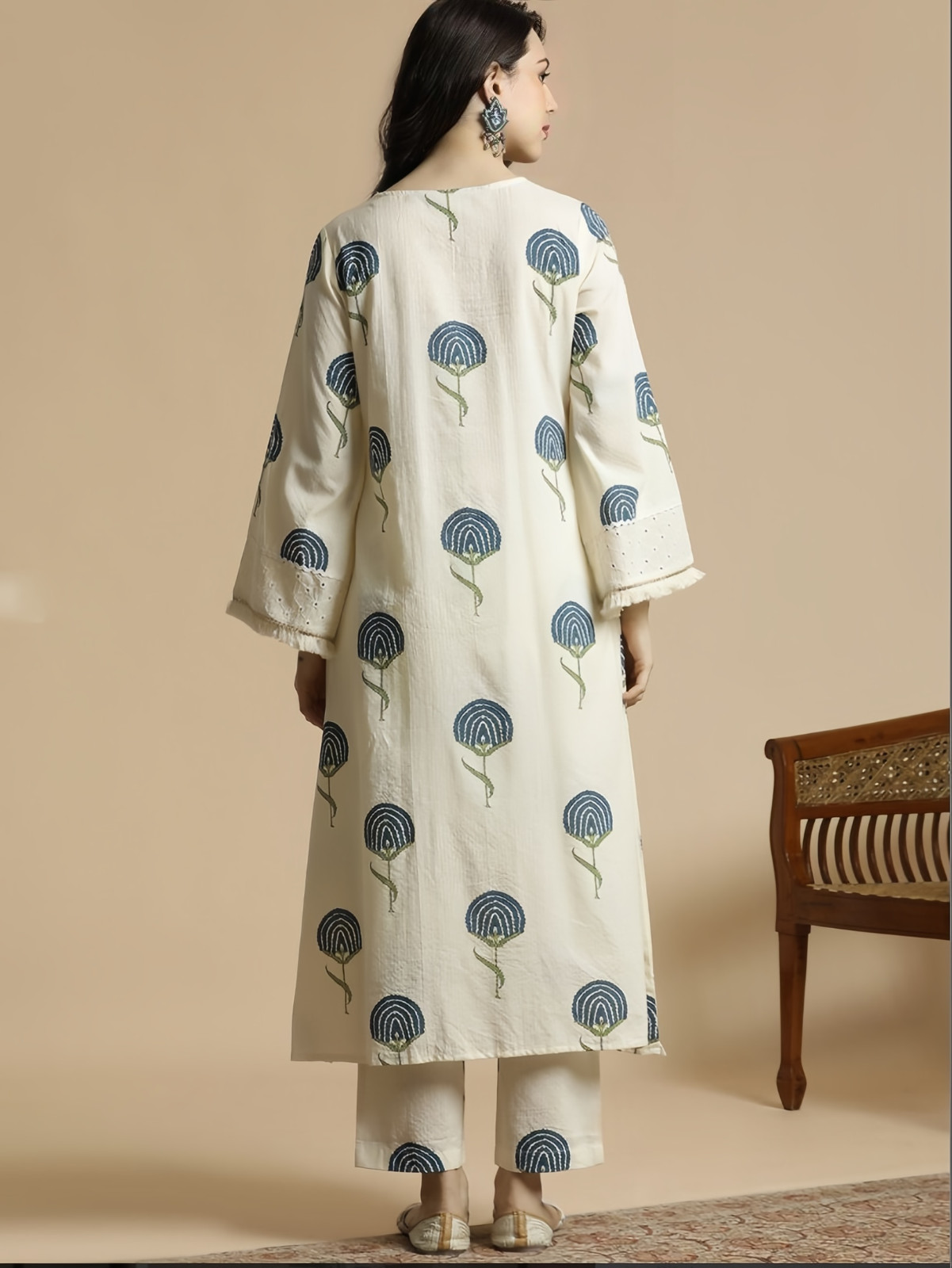Floral Print Cotton Kurta with Pants Bell Sleeves Embroidered Neckline