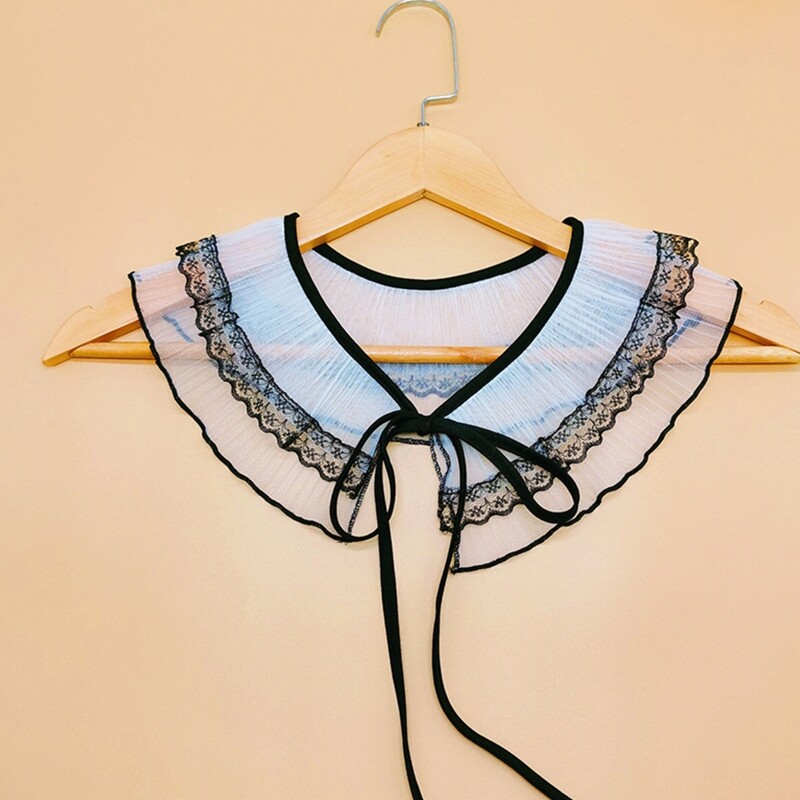 Women Sweet Pleated Mesh Shawl Fake Collar Contrast Color Trim Lace Cape Scarf