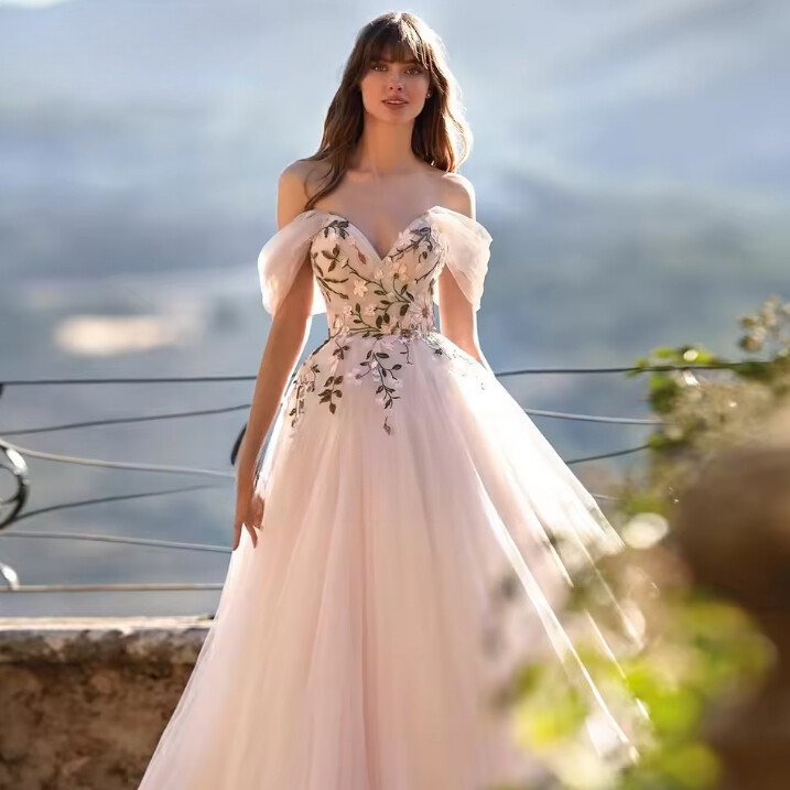 как выглядит Colorful Embroidered Whimsical Wedding Dress Floral Lace Appliques Off Shoulder фото