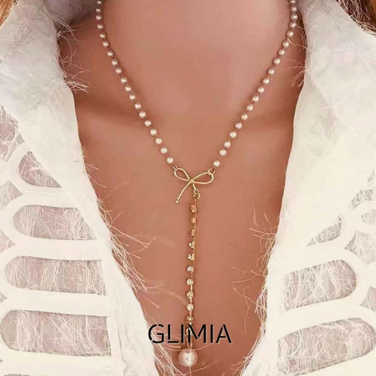 Pearl Bow Drop Elegant Pearl Choker with Gold Ribbon Crystal Dangle