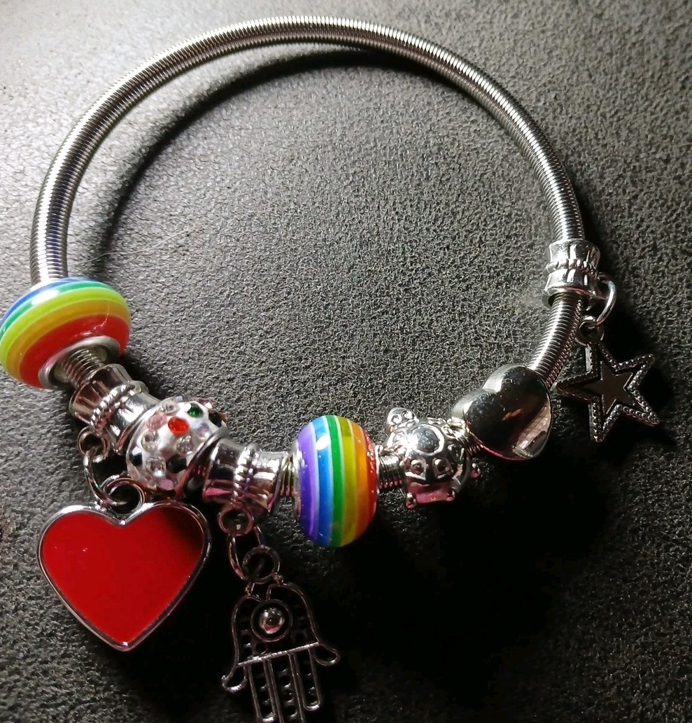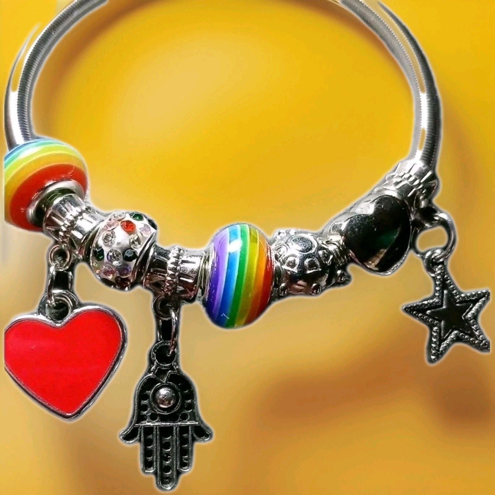 как выглядит Rainbow Colored Charms, Stretch Bracelet, With Colorful Charms , Silvertone фото