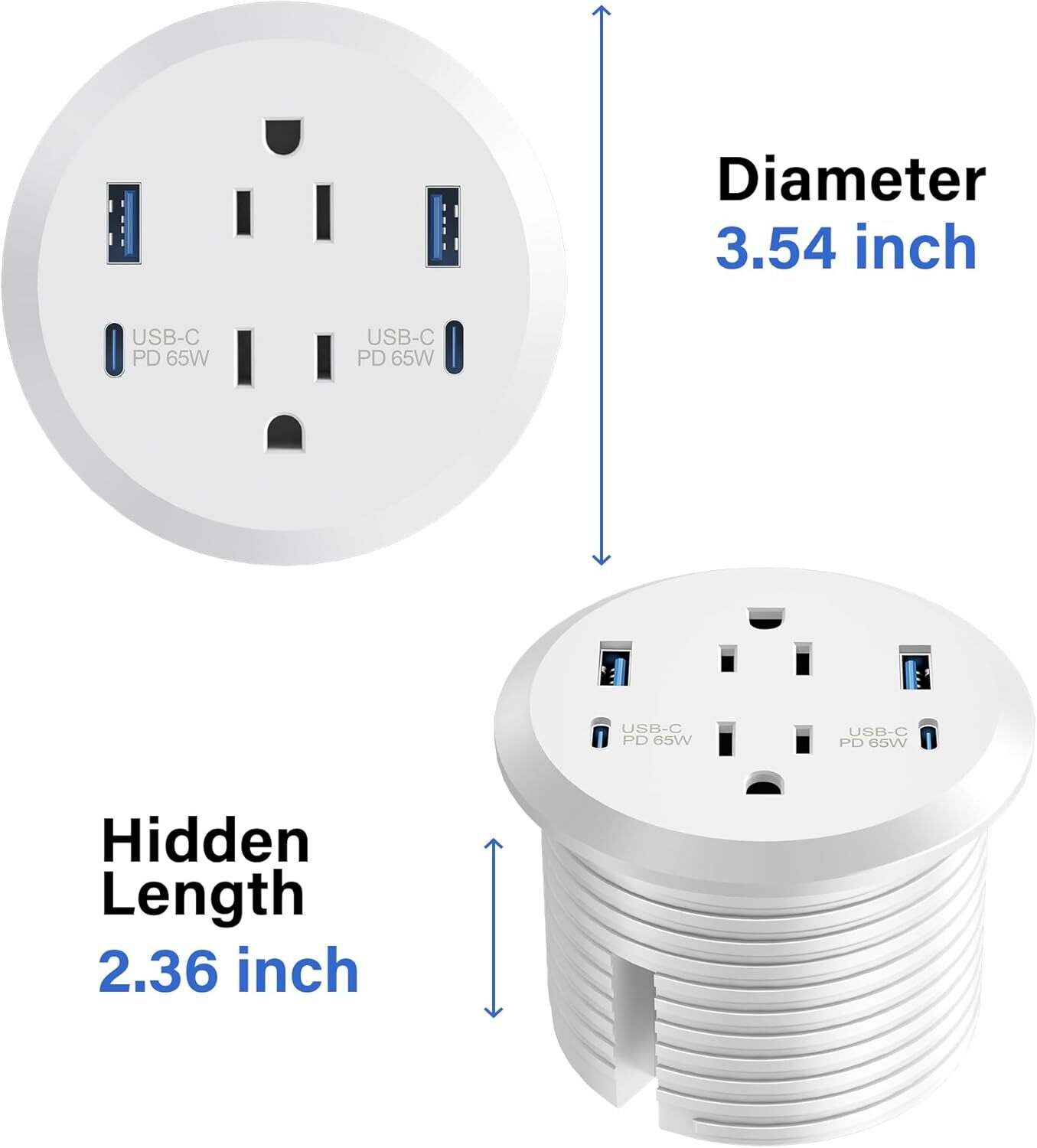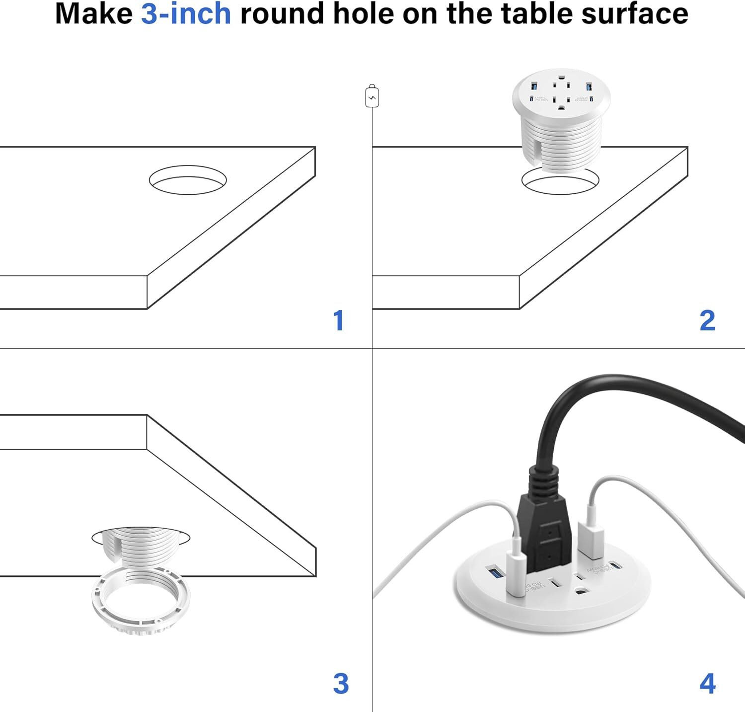[Desk Hole Grommet with PD 20W USB-C]: Built-in USB-C charging port on the top of the desk power strip.