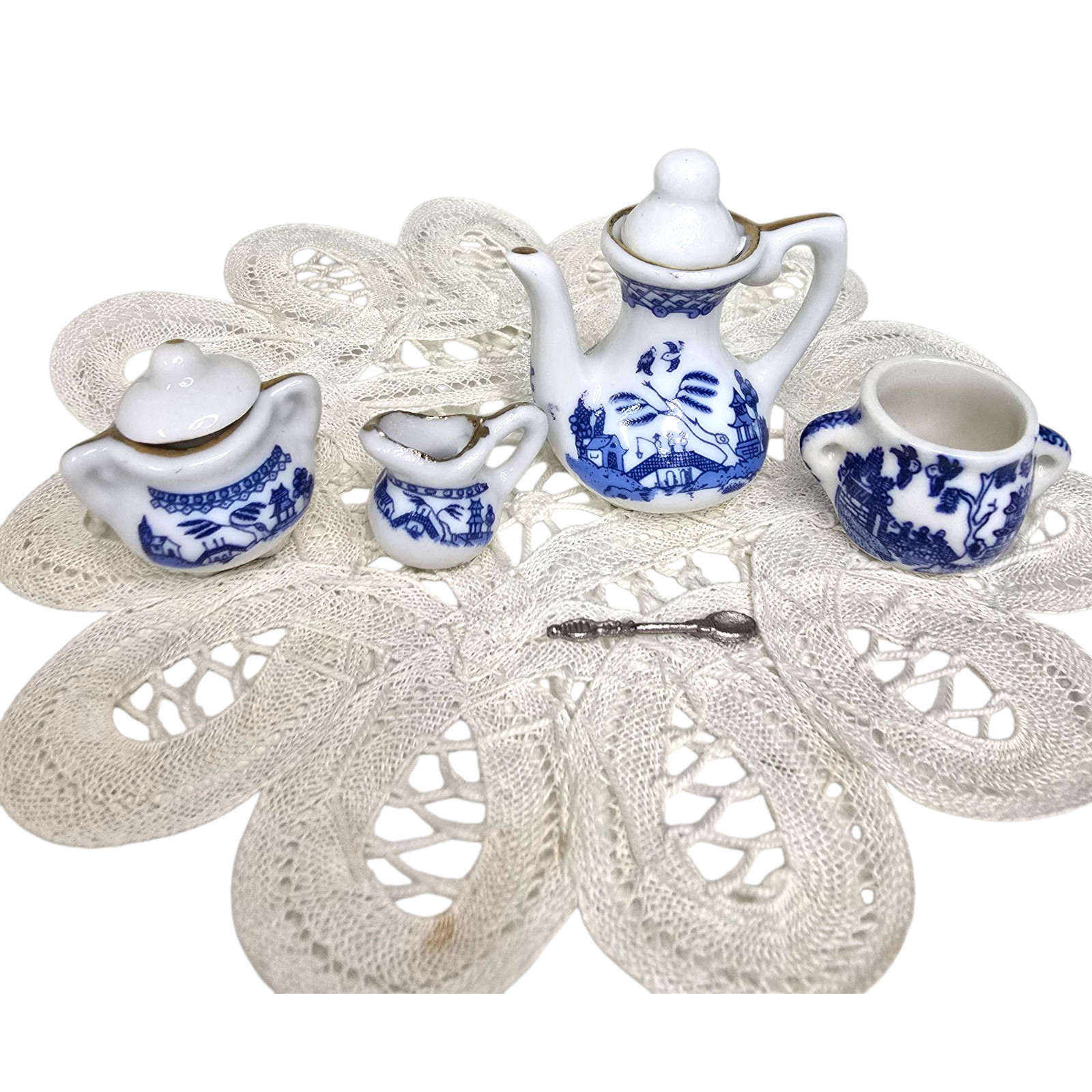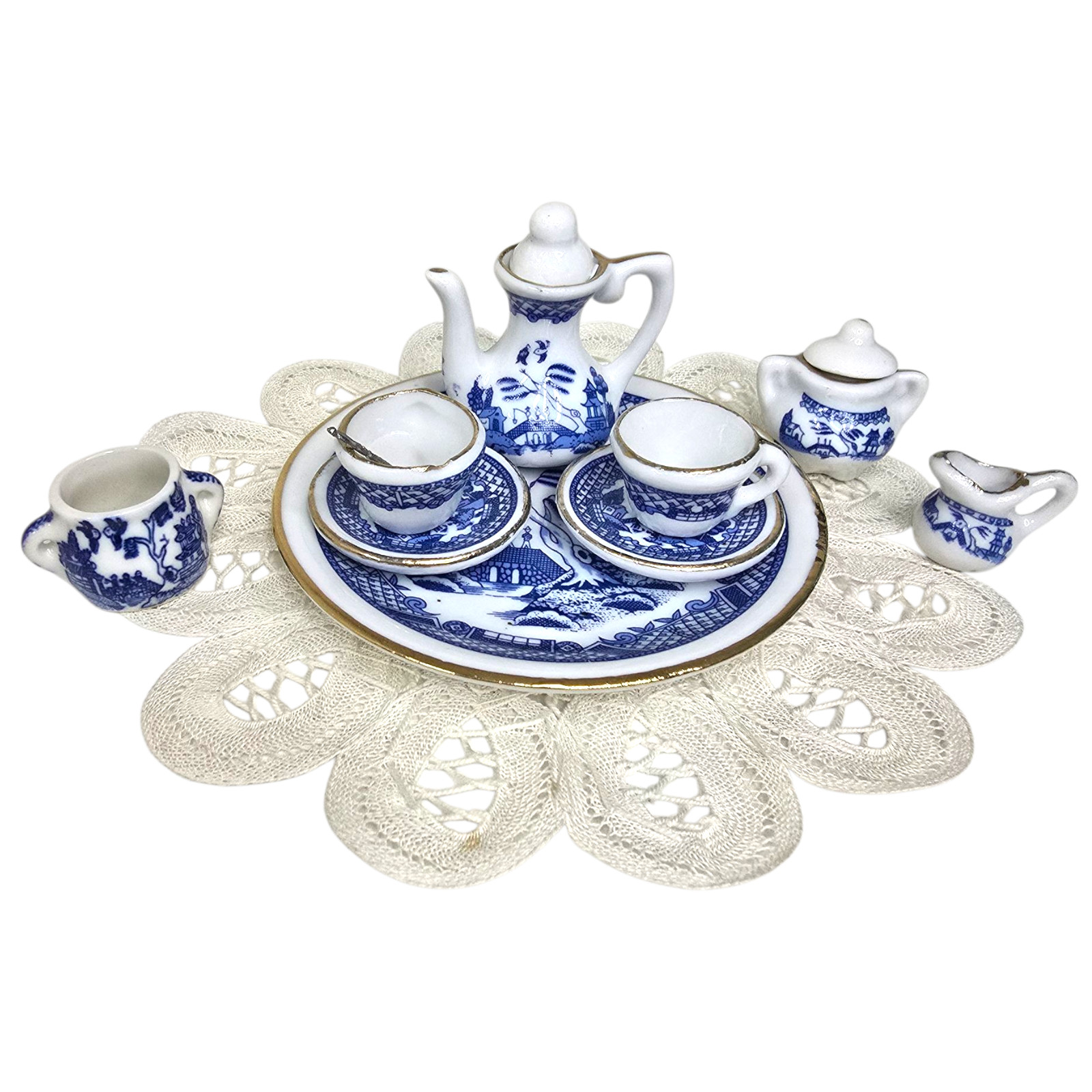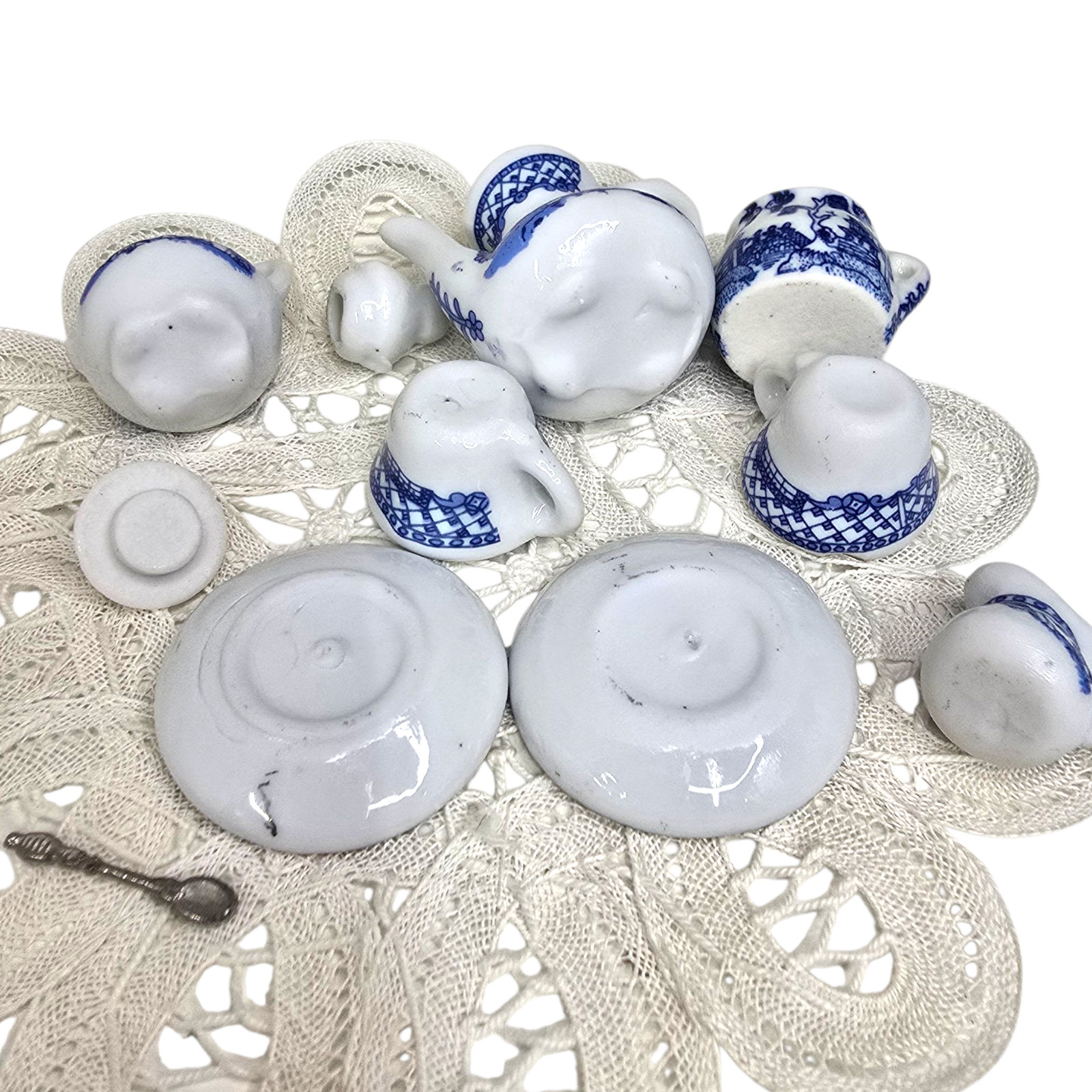 Vintage 13 pc Miniature Blue Willow Doll Tea Set with Doily Tiny Spoon Lids