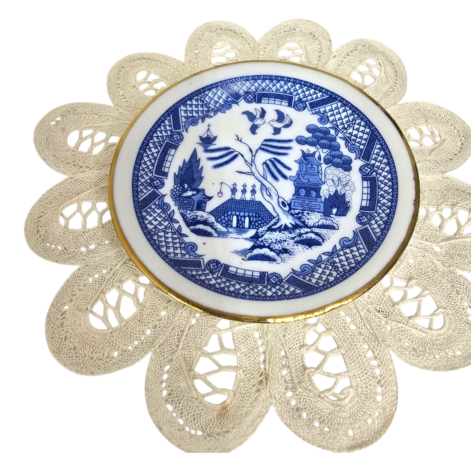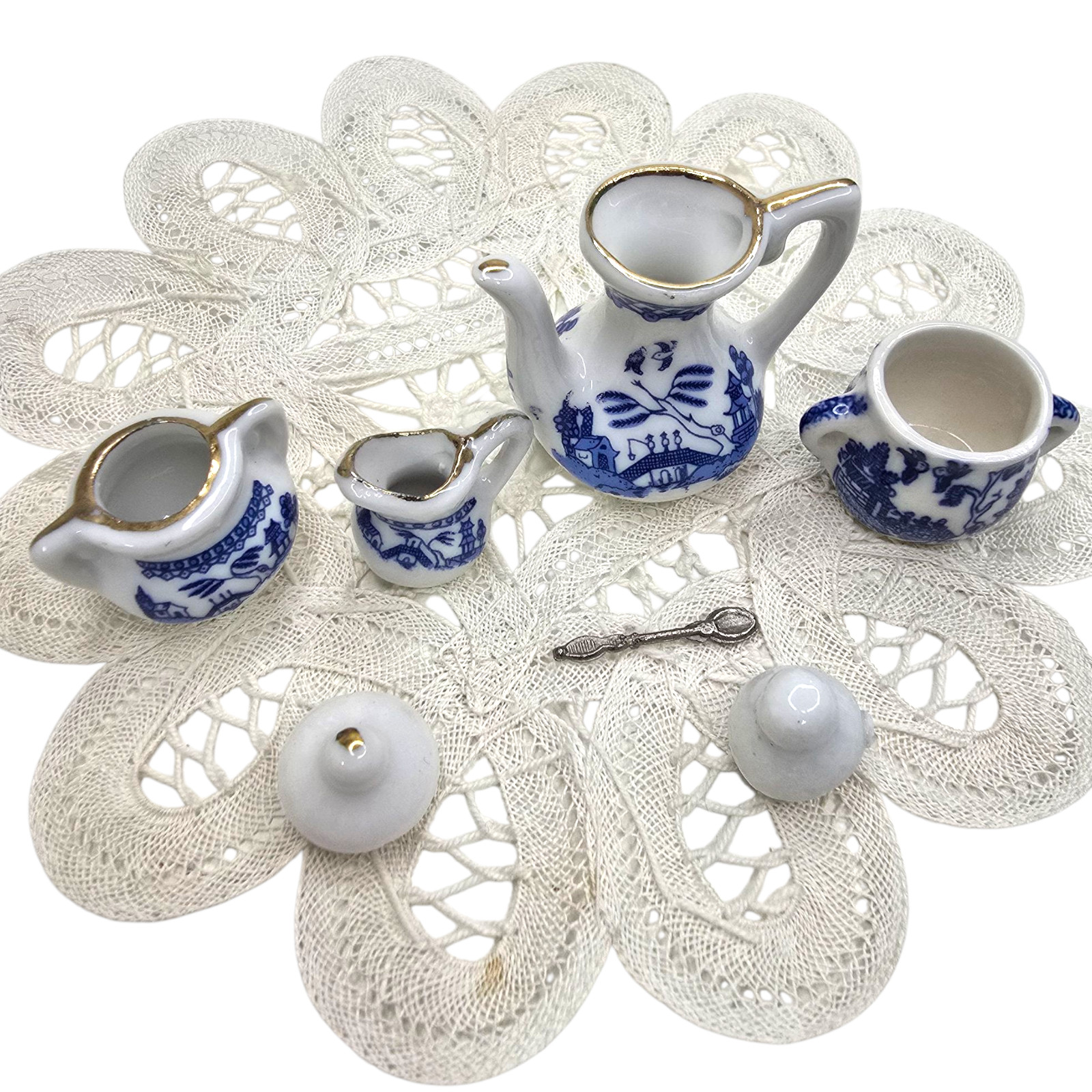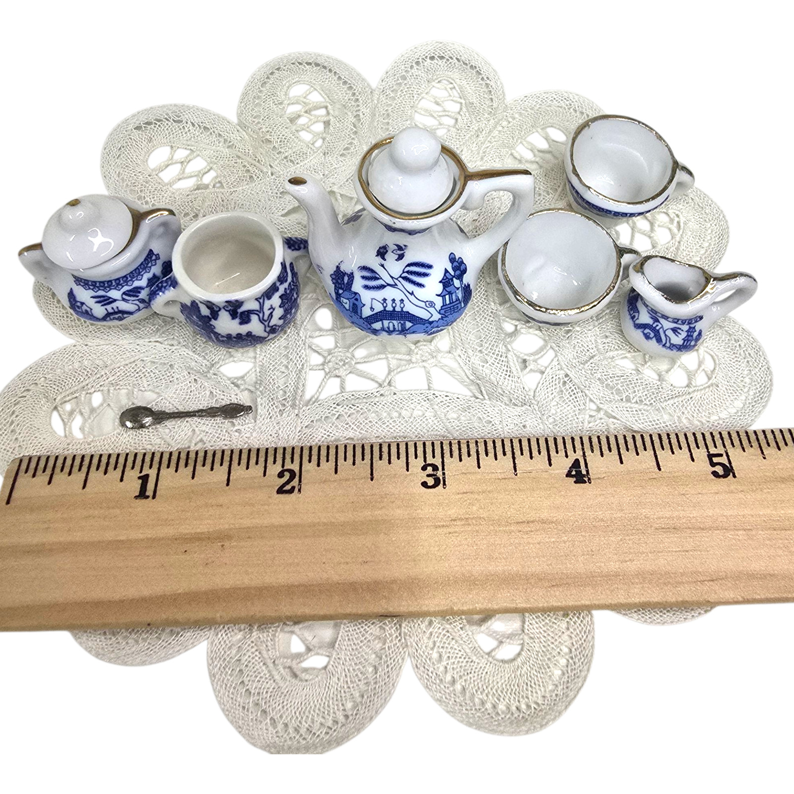 Vintage 13 pc Miniature Blue Willow Doll Tea Set with Doily Tiny Spoon Lids