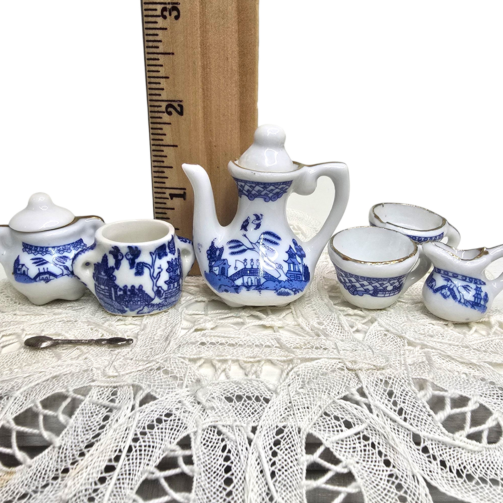 • Vintage 13 pc Miniature Blue Willow Doll Tea Set with Doily Tiny Spoon Lids