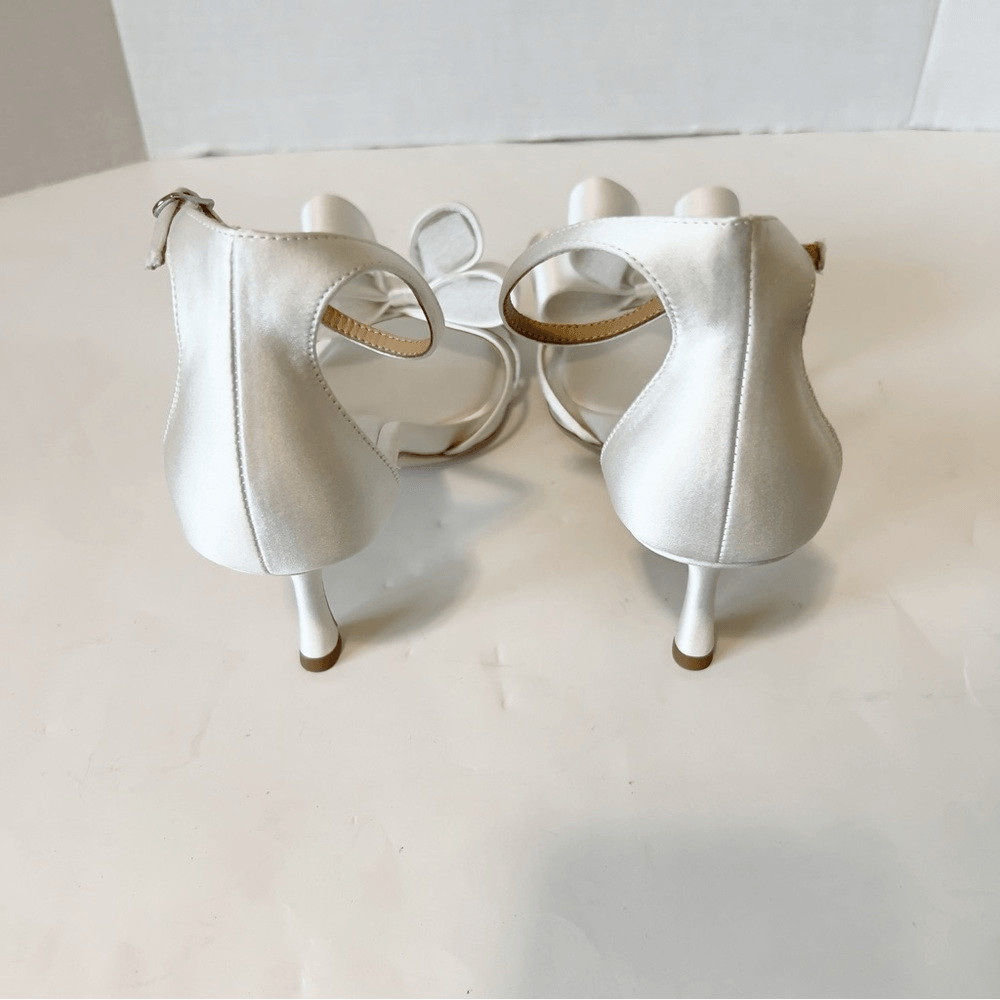 как выглядит Badgley Mischka Alysha White Satin Open Toe Kitten Heel Bridal Sandal Size 7.5 фото