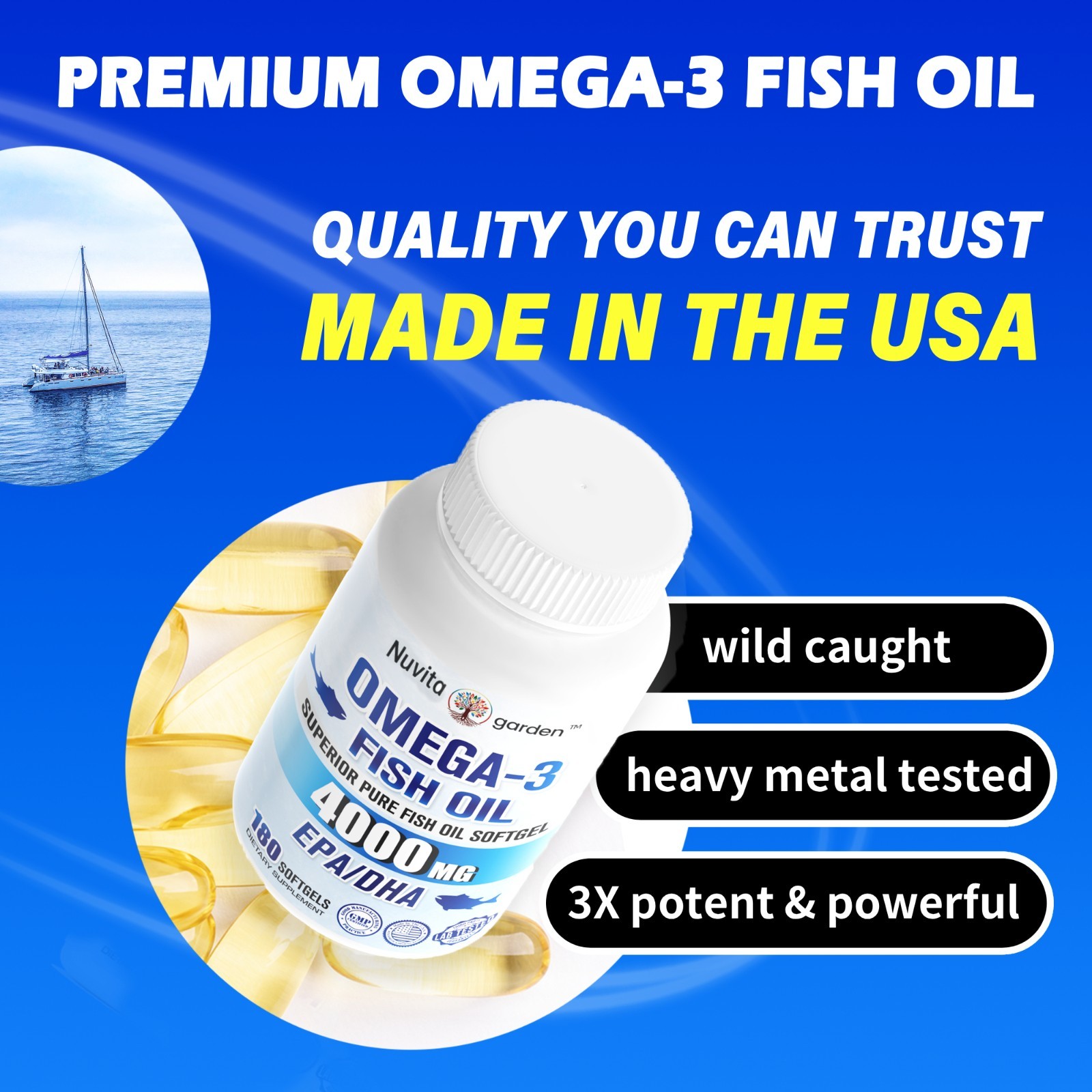 Omega 3 Fish Oil Softgels 3x Strength 1200mg EPA DHA, Burpless 180 Softgels