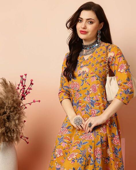 как выглядит Indian Women yellow Cotton Floral Printed Anarkali Kurta Kurti Dress фото