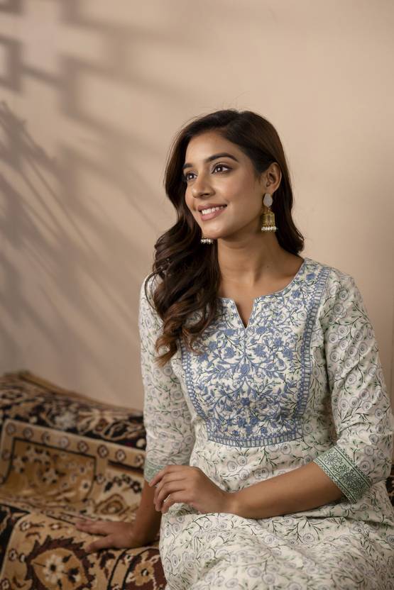как выглядит Indian Women white Cotton Floral Printed Anarkali Kurta Kurti Dress фото