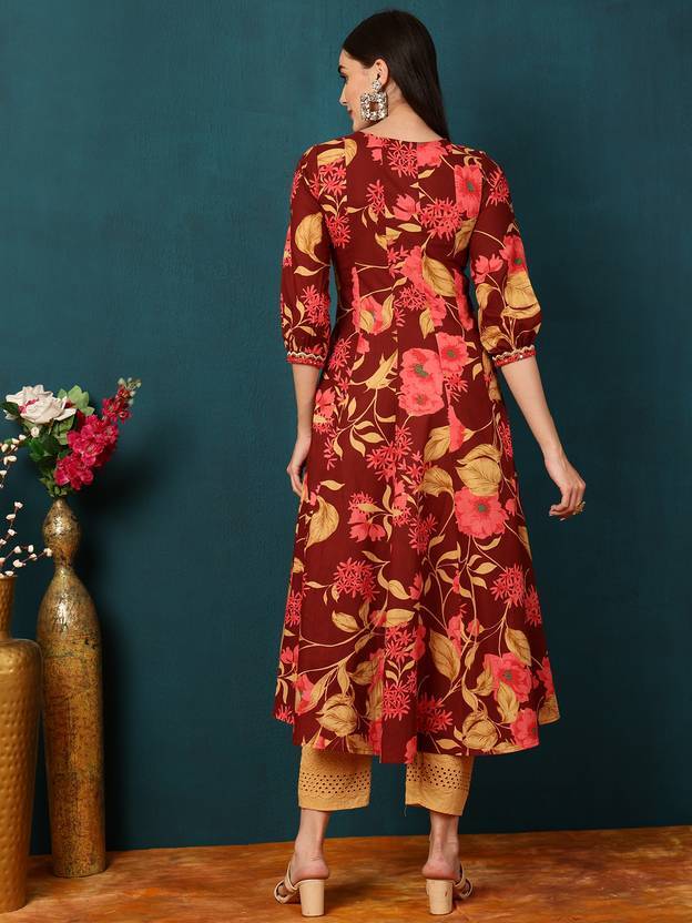 как выглядит Indian Women maroon Cotton Floral Printed Anarkali Kurta Kurti Dress фото