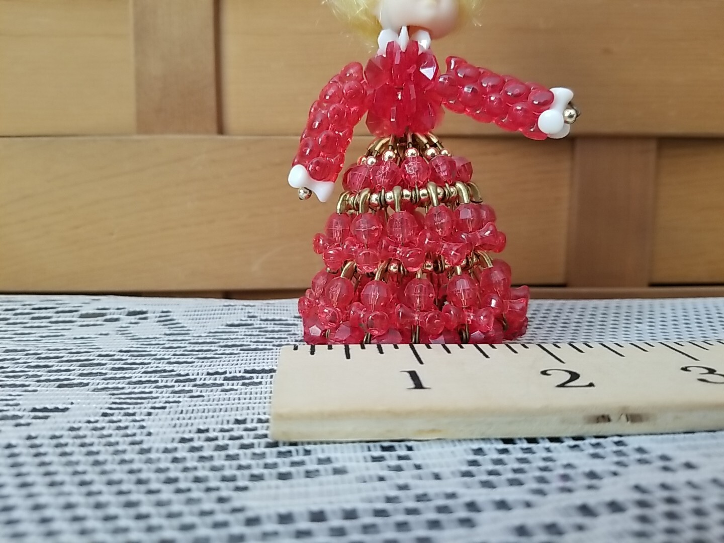 как выглядит Vintage 50s Beaded Safety Pin Craft Doll Red Dress Kitsch Retro фото