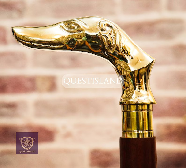как выглядит Walking Stick Dog Head Handle Brass Wooden Victorian Foldable Cane Collectible фото