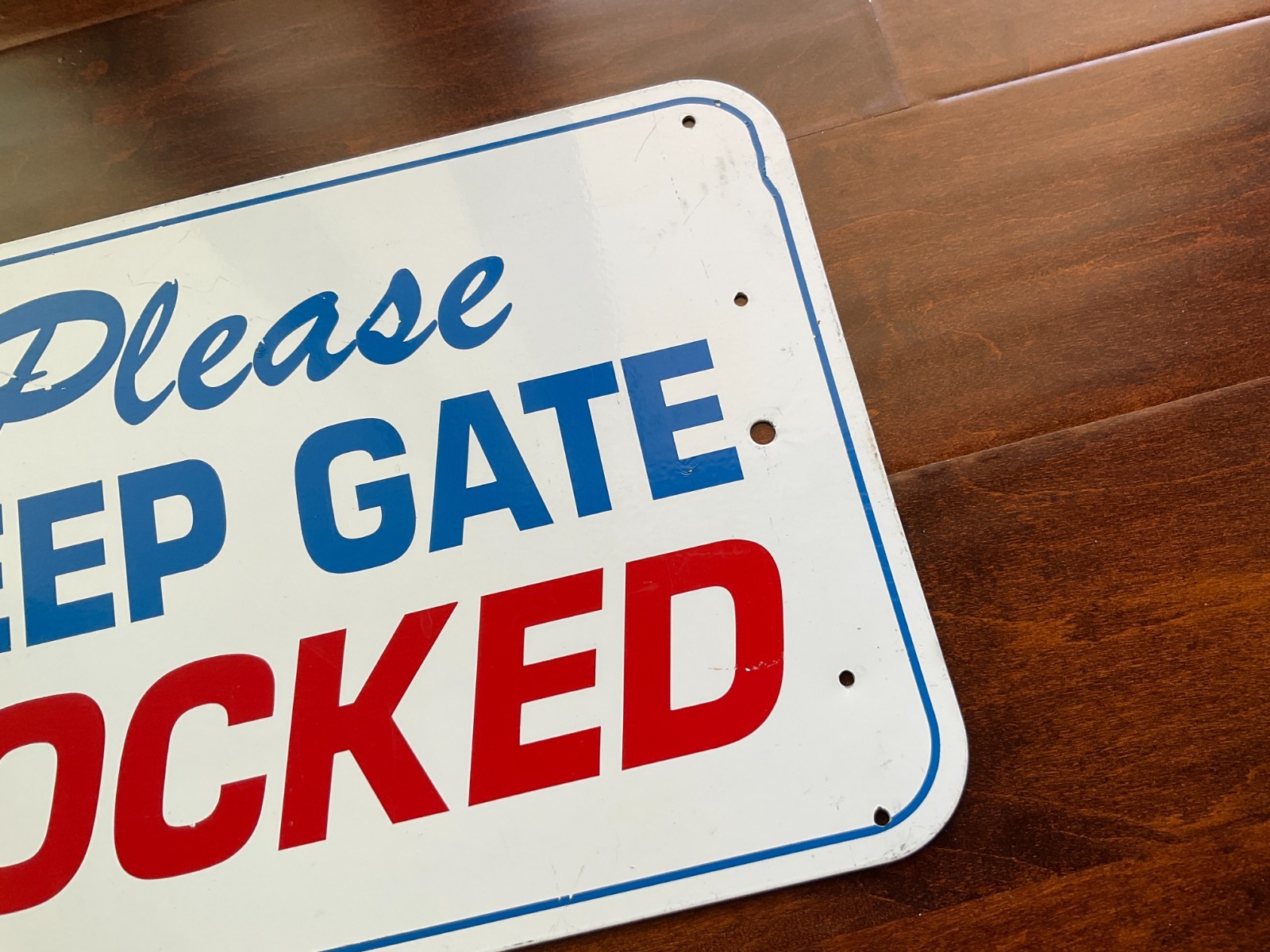 Metal Sign Please KEEP GATE LOCKED 12 x 18 Horizontal Red Blue on White