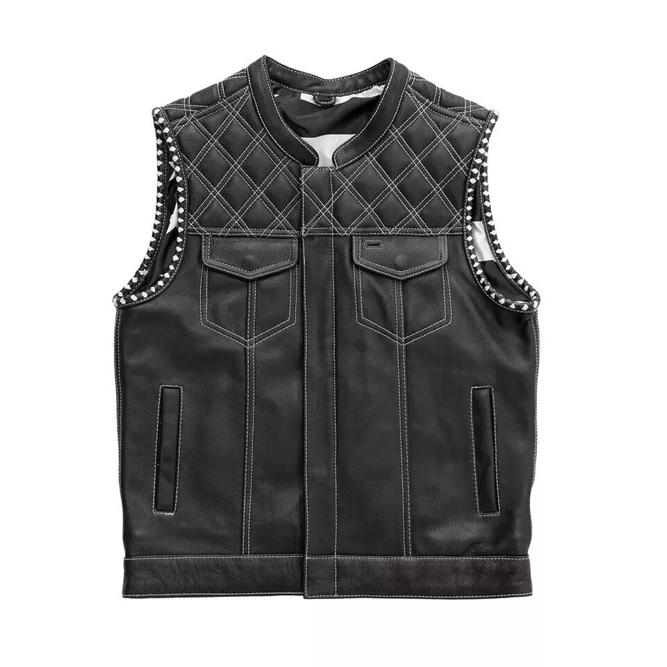 Men's Black Cross Stitch Leather Club Vest - American Flag Lining, Conceal Carry