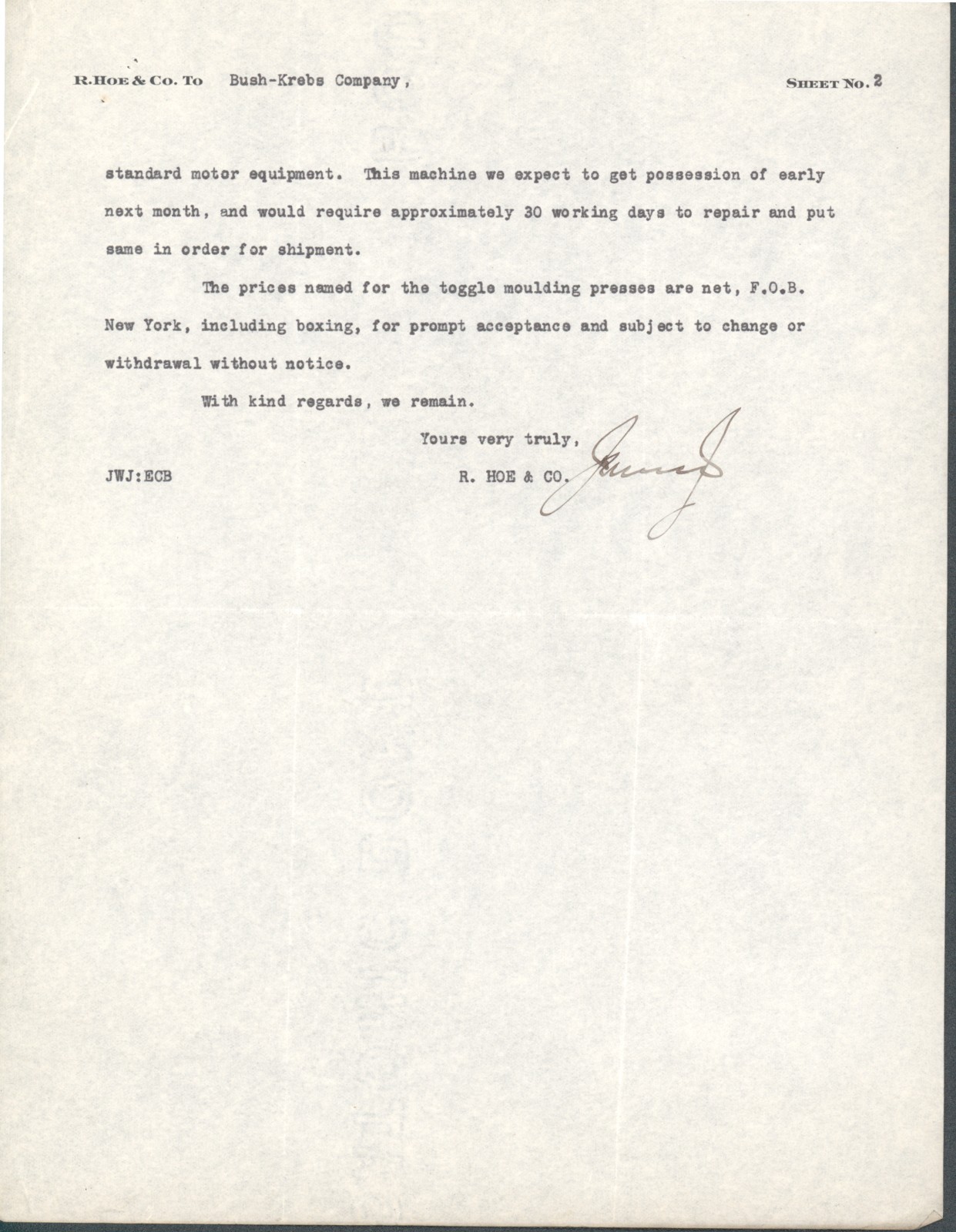 Correspondence 1920-21 R. Hoe Company Printing Press Bush-Krebs Louisville