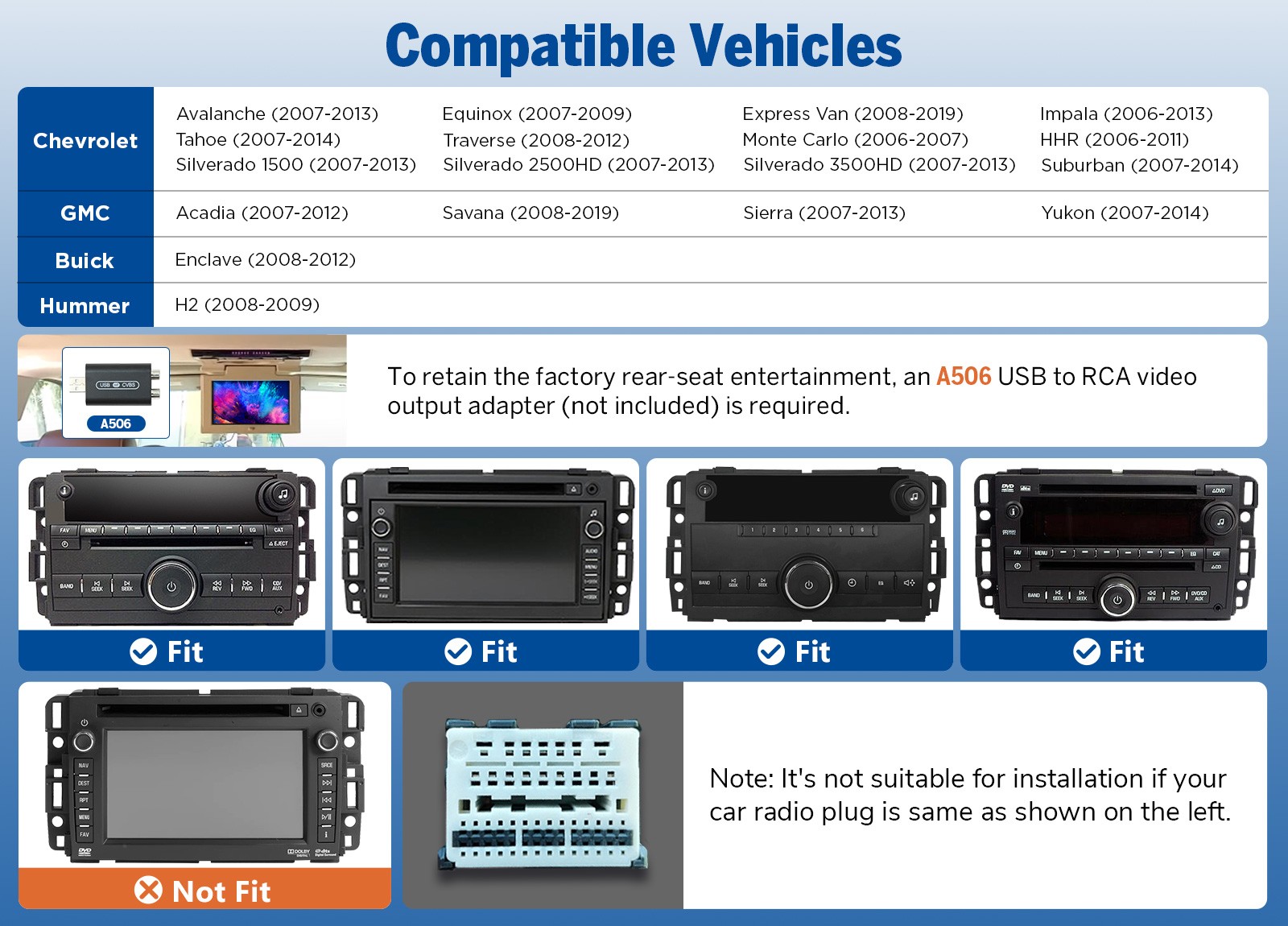 Avalanche 2007-2013, Equinox 2007-2009, Express Van 2008-2019, HHR 2006-2011, Impala 2006-2013, Monte Carlo 2006-2007, Silverado 1500 2007-2013, Silverado 2500HD 2007-2013, Silverado 3500HD 2007-2013, Suburban 2007-2014, Tahoe 2007-2014, Traverse 2008-2012, Enclave 2008-2012, Acadia 2007-2012, Savana 2008-2019, Sierra 2007-2013, Yukon 2007-2014, H2 2008-2009 |