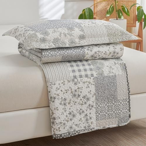 Grey White Floral Plaid Quilt King Size King 106 in x 96 in Grey Beige White