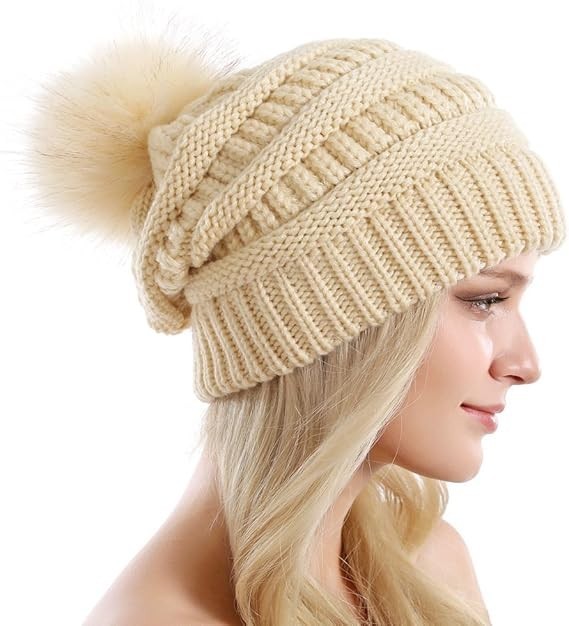 как выглядит Women Knit Slouchy Beanie Chunky Baggy Hat with Faux Fur Pompom Winter Soft W... фото