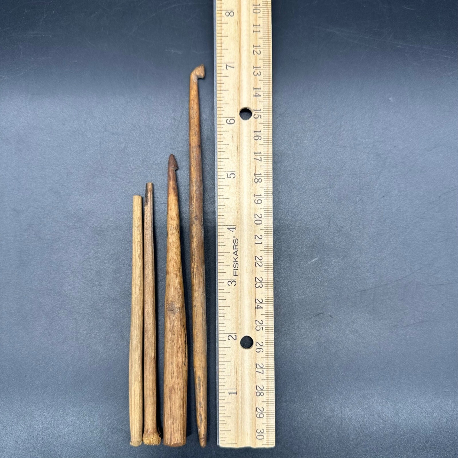 Vintage Wooden Crochet Knitting Hooks Tools Retro Handmade Lot of Four Crafting