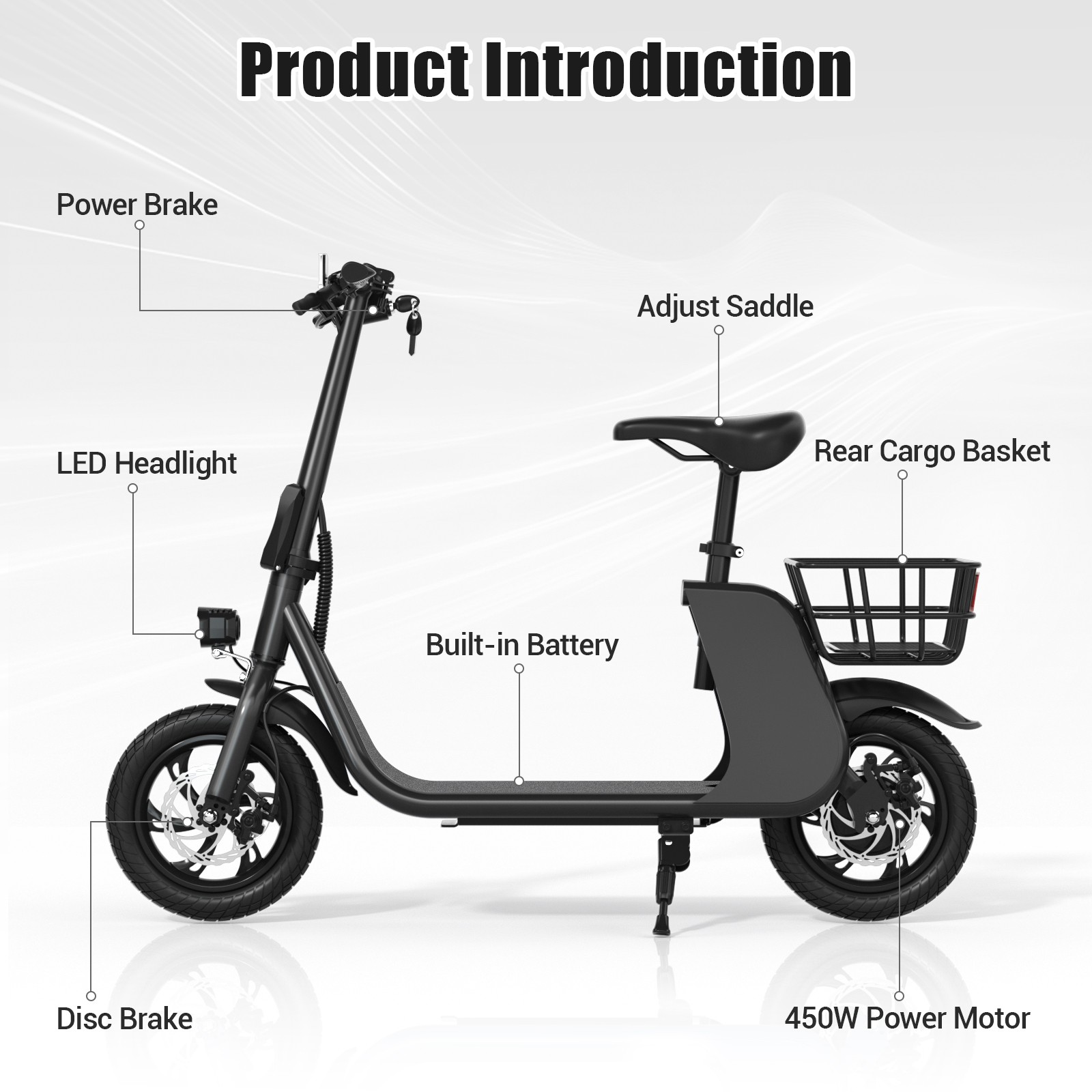 450W Foldable Electric Scooter for Adults w/Seat Sports Moped Commuter E-Scooter
