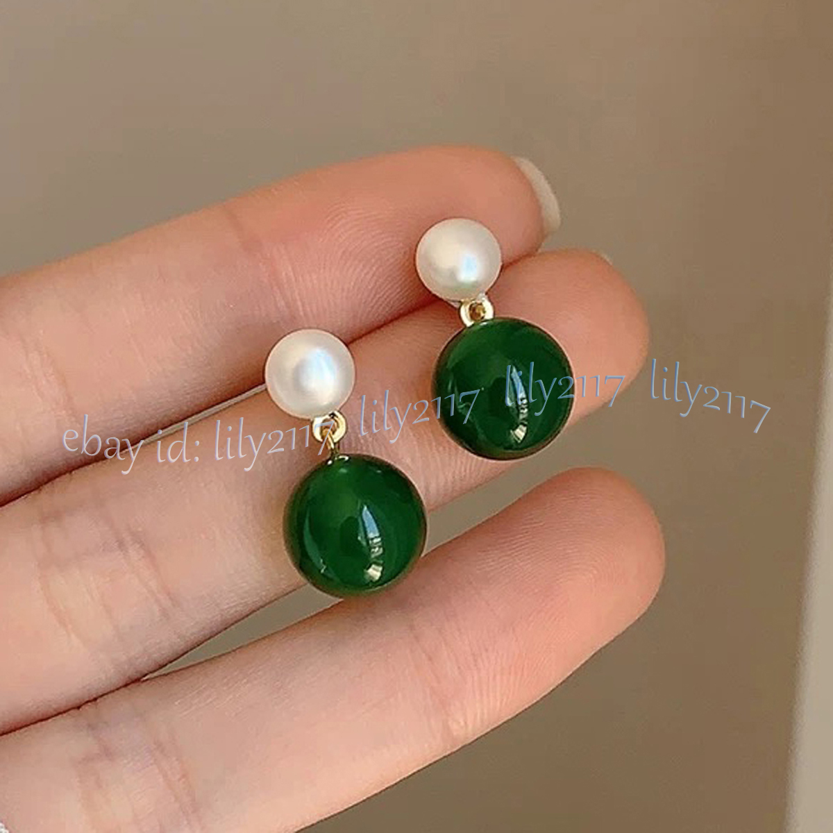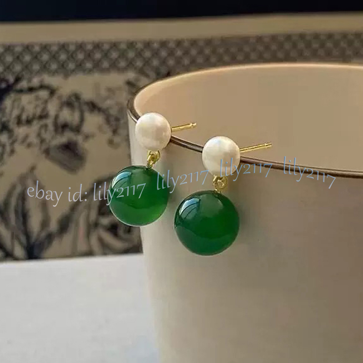 Natural 7-8mm White Pearl 10mm Jade Round Gemstone Beads Dangle Stud Earrings