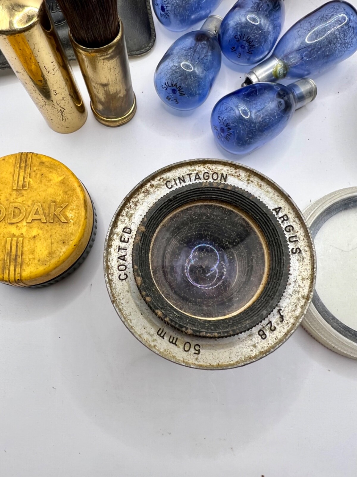 Vintage Camera Accessories Lot, Flash Bulbs, Brush, Bakelite Case, Leather Cases