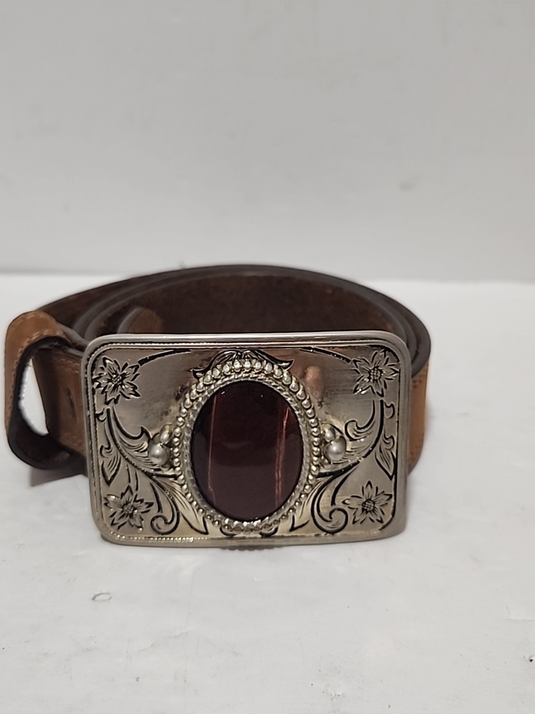 Cowboy Western Belt Buckle Tigers Eye Floral Scroll Cowgirl W/Brown Belt