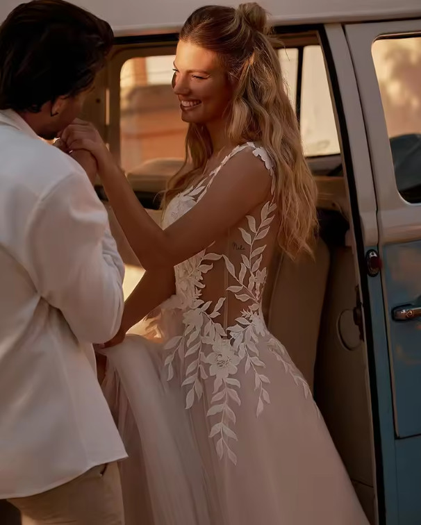 как выглядит Vintage V Neck Wedding Dresses A Line Tulle Bride Gown Illusion Back Applique фото